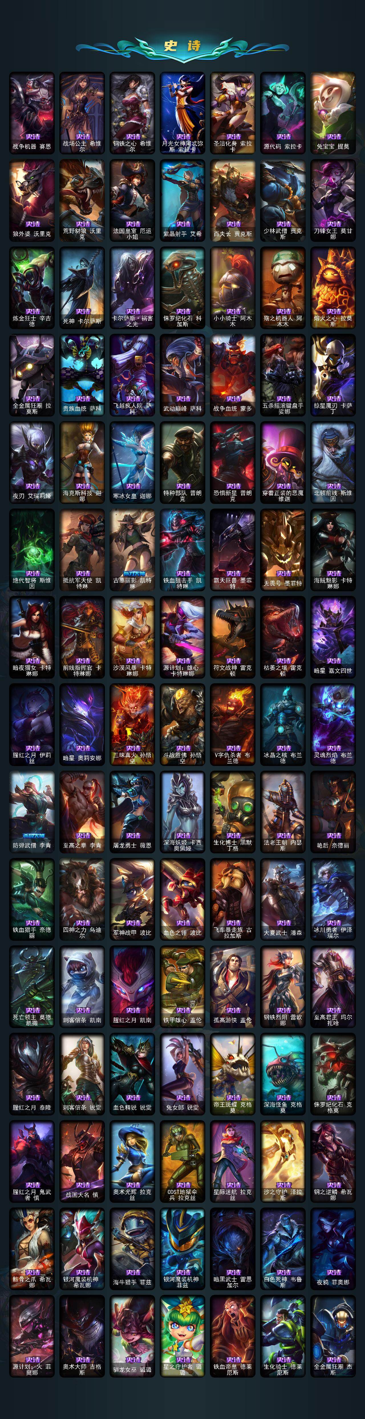 【神话皮肤】:十周年纪念安妮,源代码乐芙兰,暗星科加斯,神凰行者瑞羽圣凰艾尼维亚,海克斯科技安妮,海克斯科技崔丝塔娜,海克斯科技吉格斯,海克斯科技雷克顿,零之枪骑赫卡里姆,至臻灵能特工伊泽瑞尔,至臻神龙尊者炎龙瑟提,至臻腥红之月亚托克斯