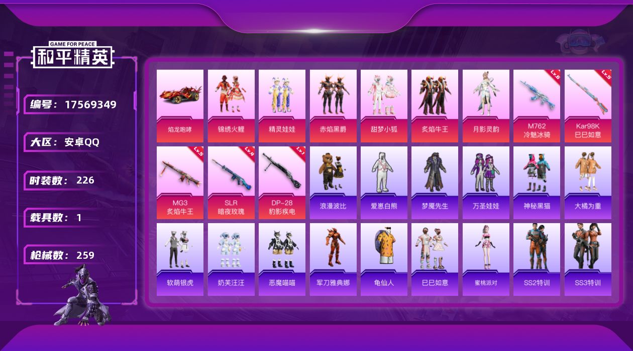 [17569349]安卓 手Q-6粉装-5特效枪-1载具-4粉色飞行器-78579热力值-10王牌印记-226套装-259枪皮