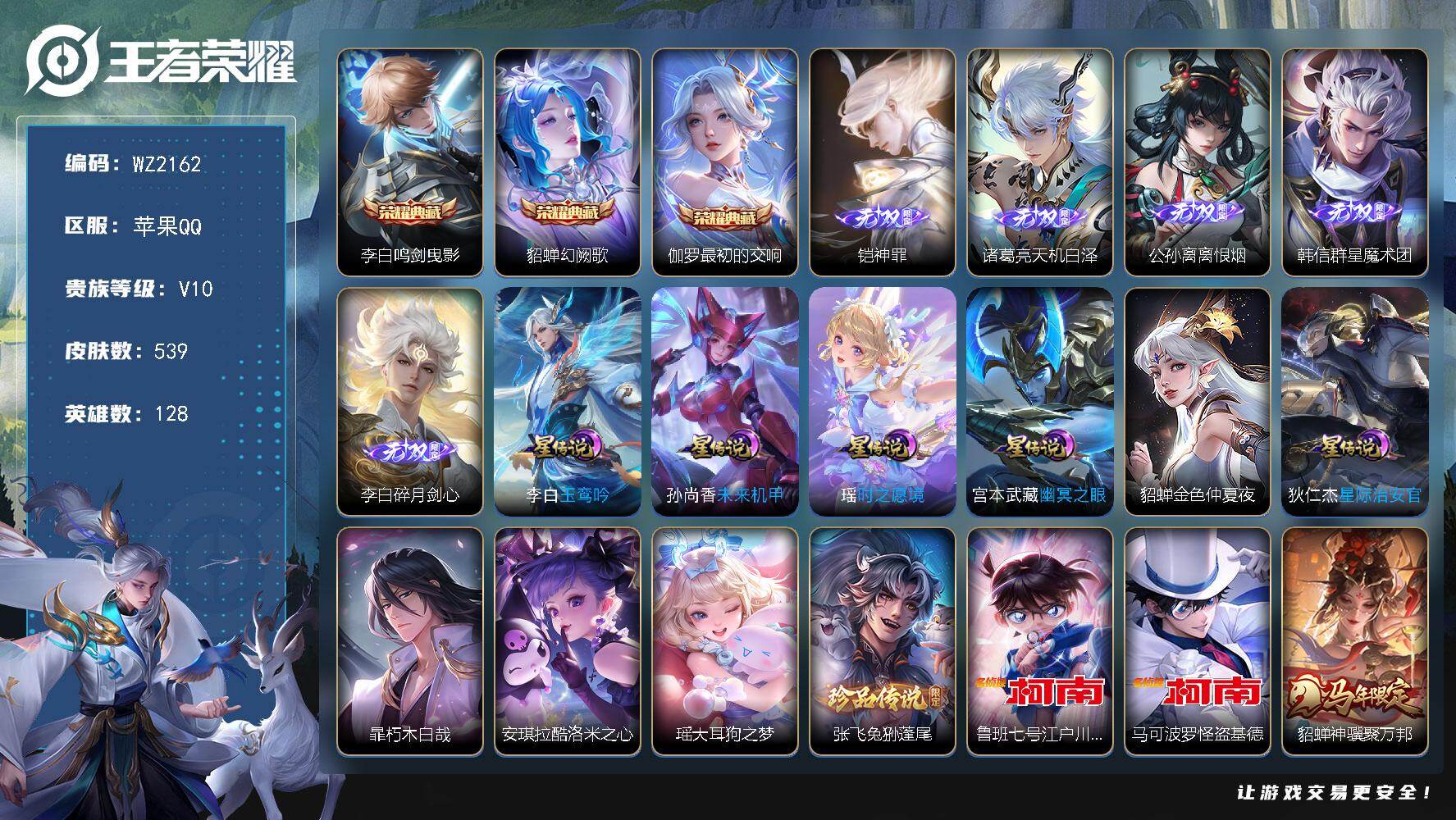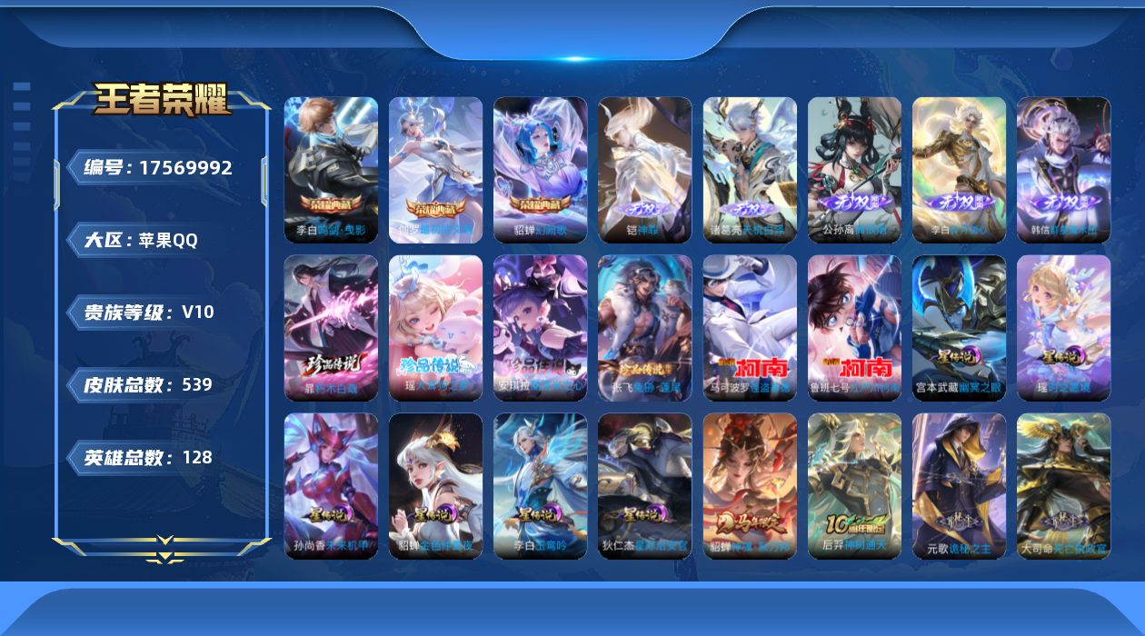 [17569992]苹果Q-V10-最强王者段位-128英雄-539皮肤-3典藏皮肤-5无双-6珍品传说-48传说-177史诗