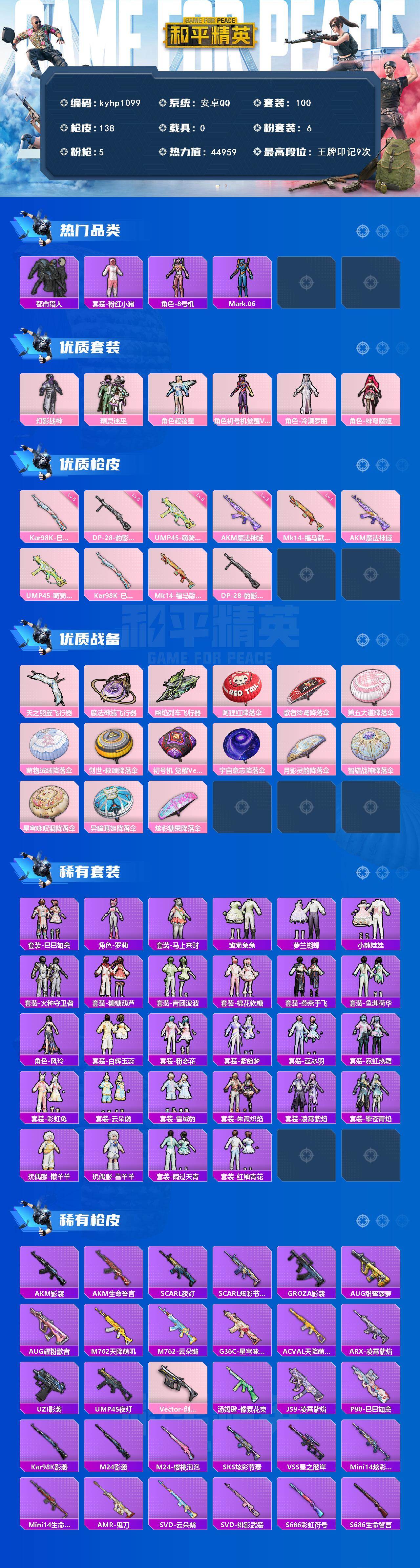 [17570199]安卓 手Q-6粉装-5特效枪-0载具-3粉色飞行器-44959热力值-9王牌印记-100套装-138枪皮 【热门品类】:套装-都市猎人,套装-粉红小猪,角色-8号机,角色-Mark.06 【粉色套装】:粉装-幻影战神,粉装-精灵迷巫,角色-超弦星,角色-初号机 觉醒Ver.,角色-冷漠罗丽,角色-绯穹魔姬 【粉色枪皮等级】:AKM-魔法神域(三级),UMP45-萌骑冒险(五级),Kar98K-巳巳如意(五级),Mk14-福马献瑞(一级),DP-28-豹影疾电(五级) 【粉色枪皮】:AKM-魔法神域,UMP45-萌骑冒险,Kar98K-巳巳如意,Mk14-福马献瑞,DP-28-豹影疾电 【粉色飞行器】:天之羽翼飞行器,魔法神域飞行器,幽焰列车飞行器 【粉色降落伞】:阿狸红降落伞,歌者泠鸢降落伞,第五大道降落伞,萌物绒绒降落伞,创世·救赎降落伞,初号机 觉醒Ver.降落伞,宇宙意志降落伞,月影灵韵降落伞,智耀战神降落伞,星穹咏叹调降落伞,异瞳寒姬降落伞,炫彩糖果降落伞 【稀有套装】:套装-巳巳如意,角色-罗莉,套装-马上来财,套装-雏菊兔兔,套装-萝兰蝴蝶,套装-小熊娃娃,套装-火种守卫者,套装-糖糖葫芦,套装-青团波波,套装-棉花软糖,套装-燕燕于飞,套装-鱼渊荷华,角色-风玲,套装-白辉玉蕊,套装-粉恋花,套装-紫幽梦,套装-蓝冰羽,套装-霓虹热舞,套装-彩虹兔,套装-云朵鹅,套装-雪绒豹,套装-朱霞炽焰,套装-凌霄紫焰,套装-擎苍青焰,玩偶服-懒羊羊,玩偶服-喜羊羊,套装-雨过天青,套装-红釉青花 【稀有枪皮】:AKM-影袭,AKM-生命誓言,SCAR-L-夜灯,SCAR-L-炫彩节奏,GROZA-影袭,AUG-甜蜜菠萝,AUG-耀粉歌者,M762-天降萌叽,M762-云朵鹅,G36C-星穹咏叹调,AC-VAL-天降萌叽,ARX-凌霄紫焰,UZI-影袭,UMP45-夜灯,Vector-创世·救赎,汤姆逊-像素花束,JS9-凌霄紫焰,P90-巳巳如意,Kar98K-影袭,M24-影袭,M24-樱桃泡泡,SKS-炫彩节奏,VSS-星之彼岸,Mini14-炫彩节奏,Mini14-生命誓言,AMR-鬼刀,SVD-云朵鹅,SVD-绯影武装,S686-彩虹符号,S686-生命誓言,S686-巳巳如意,S12K-夜灯,DBS-圣堂之誓,DBS-创世·救赎,SPAS-12-云朵