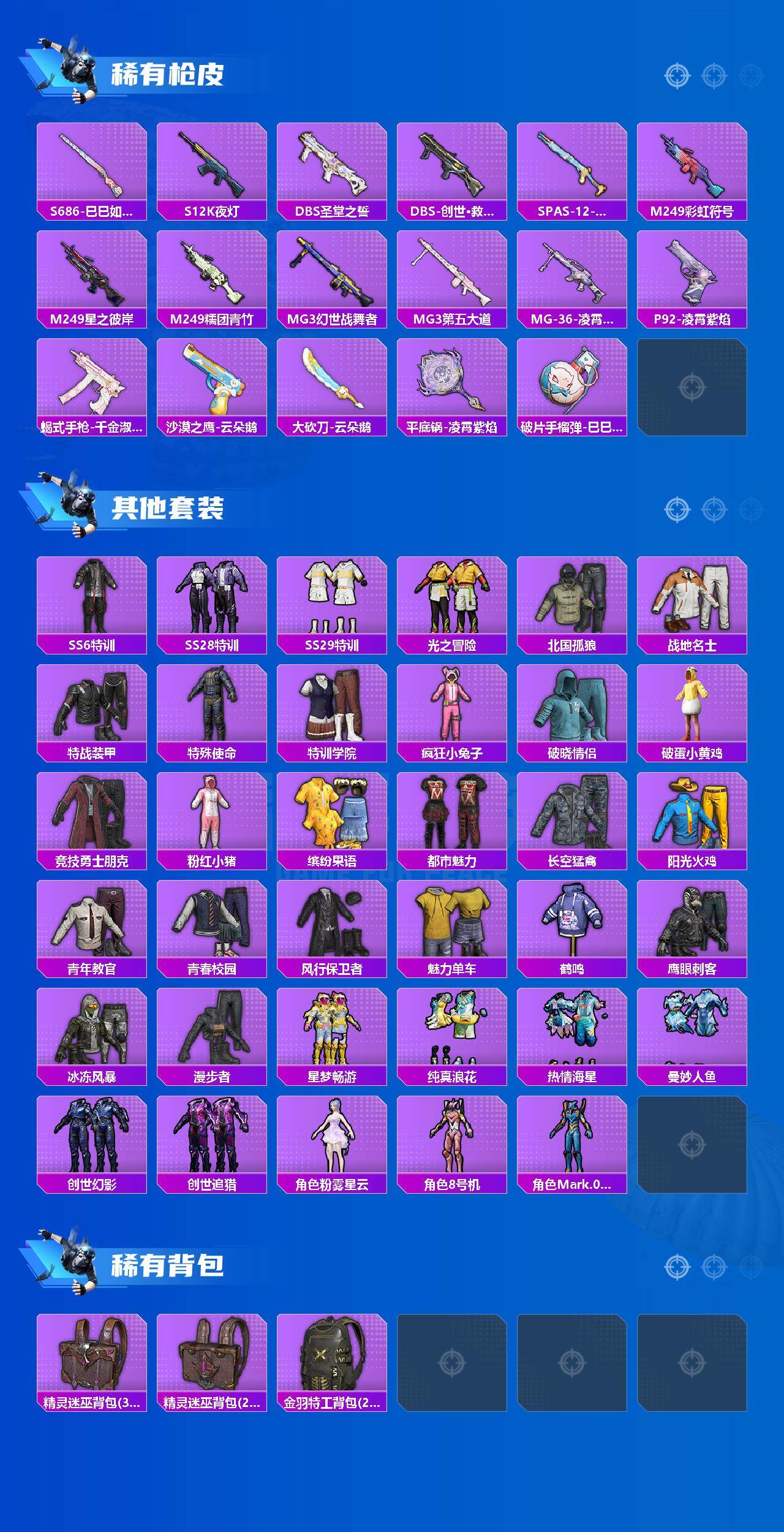 【稀有枪皮】:AKM-影袭,AKM-生命誓言,SCAR-L-夜灯,SCAR-L-炫彩节奏,GROZA-影袭,AUG-甜蜜菠萝,AUG-耀粉歌者,M762-天降萌叽,M762-云朵鹅,G36C-星穹咏叹调,AC-VAL-天降萌叽,ARX-凌霄紫焰,UZI-影袭,UMP45-夜灯,Vector-创世·救赎,汤姆逊-像素花束,JS9-凌霄紫焰,P90-巳巳如意,Kar98K-影袭,M24-影袭,M24-樱桃泡泡,SKS-炫彩节奏,VSS-星之彼岸,Mini14-炫彩节奏,Mini14-生命誓言,AMR-鬼刀,SVD-云朵鹅,SVD-绯影武装,S686-彩虹符号,S686-生命誓言,S686-巳巳如意,S12K-夜灯,DBS-圣堂之誓,DBS-创世·救赎,SPAS-12-云朵