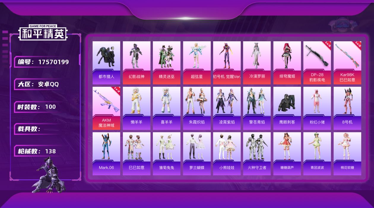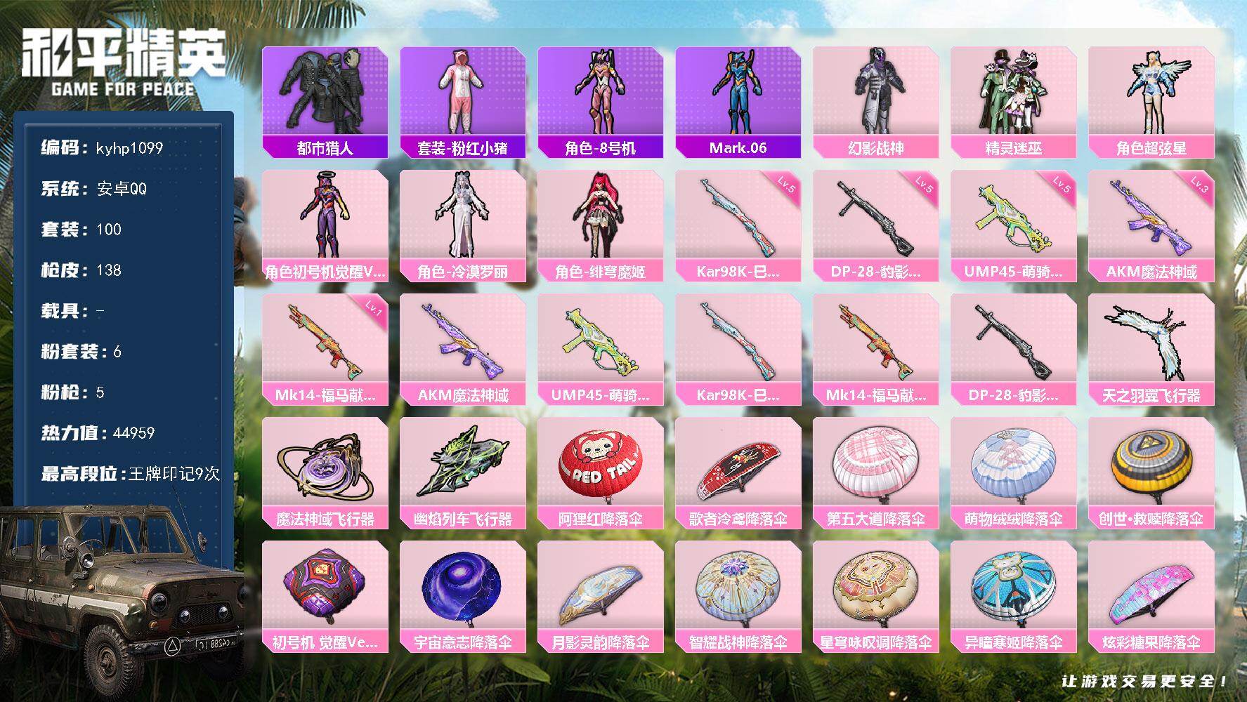 [17570199]安卓 手Q-6粉装-5特效枪-0载具-3粉色飞行器-44959热力值-9王牌印记-100套装-138枪皮
