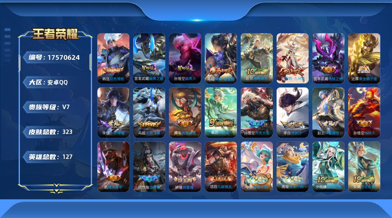 - PX_2093842-贵族8/皮肤223/传说17/史诗70/英雄125/女武神/胡桃夹子/地狱火/地狱之眼/冠军飞将/云鹰飞将/启明星使/炽阳神光/无双飞将/前尘镜/诗剑行/山海炽霜斩/山海苍雷引/齐天大圣/无限倾心男/乘龙铭钟鼎/桑启鸣野蒿/云缨幻光神枪/澜愿照九州拓/蒙犽顽岩魄/姜子牙天穹之誓/狄仁杰阴阳师/赵云皇家上将/墨子神迹守卫/降魔/钟无艳超时空战士/白起夜都怪侠/元歌无心/甄姬落雪