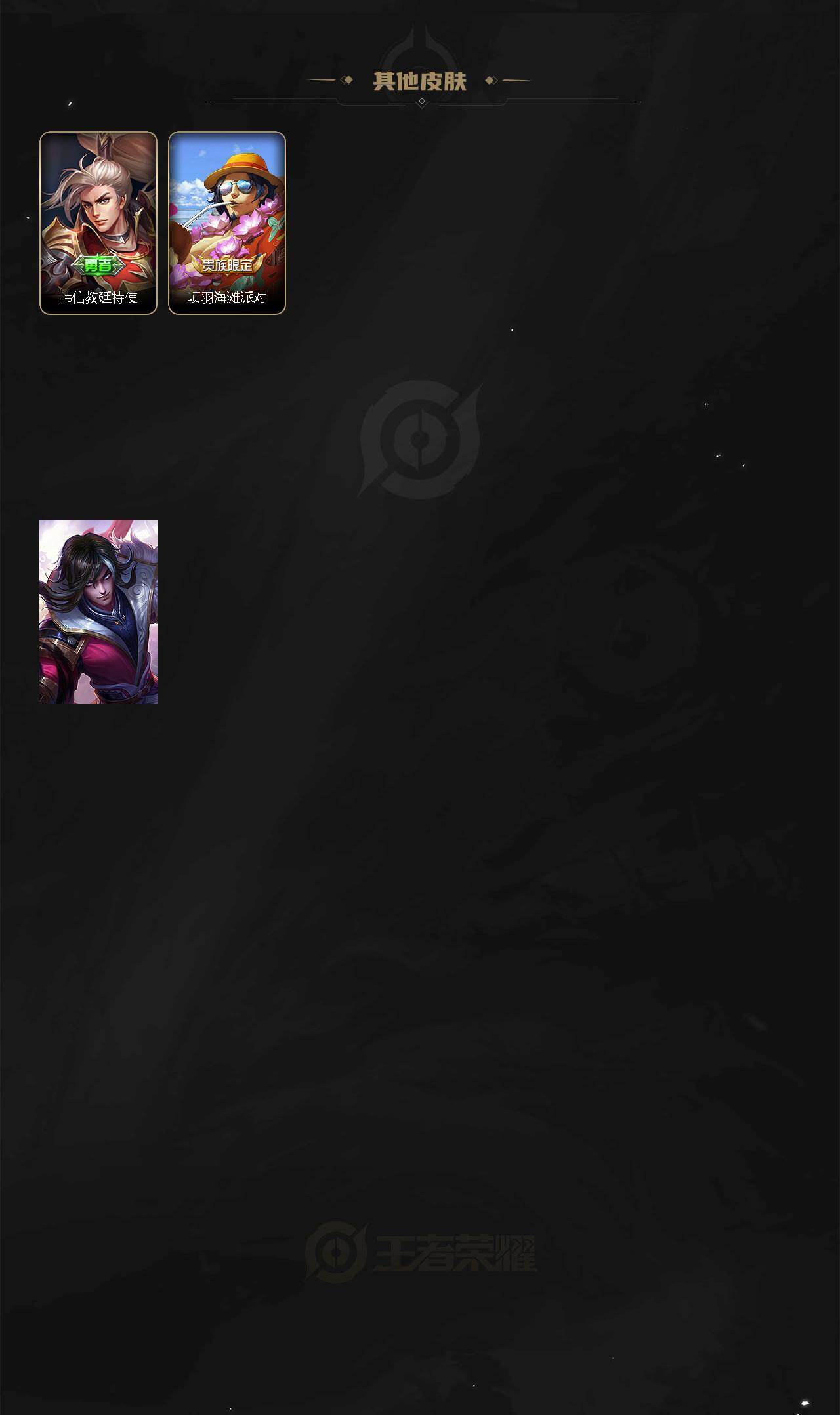 【限定皮肤】:蒙犽顽岩魄,姜子牙天穹之誓,狄仁杰阴阳师,赵云皇家上将,元歌无心,项羽海滩派对,鬼谷子天穹祈灯,铠琥珀纪元,姬小满妄想食味,沈梦溪龙舞盛年,刘邦剑破天穹,周瑜熔金海岸
