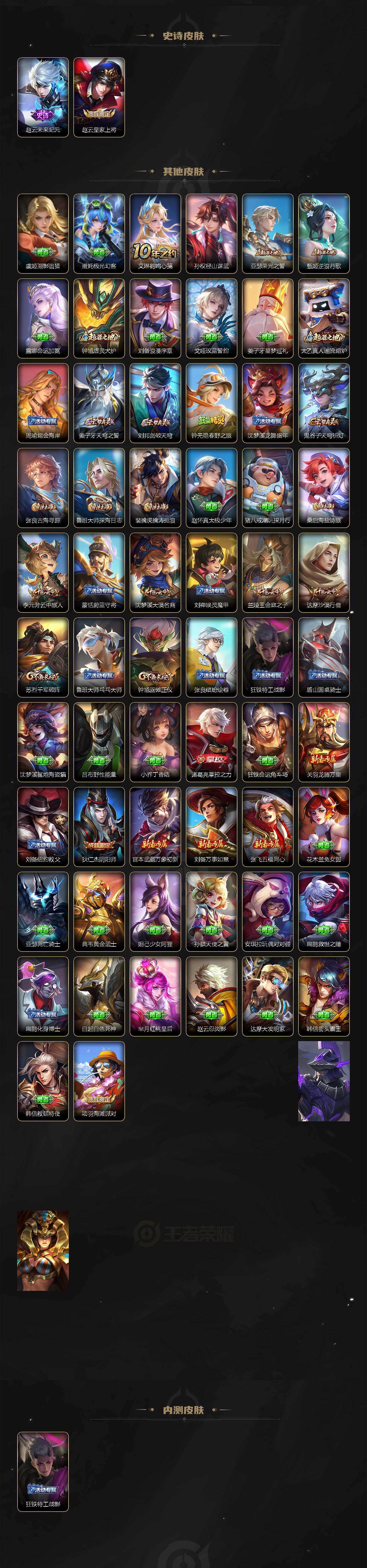 【史诗皮肤】:周瑜线条小狗,项羽九幽镇关,姬小满妄想食味,蒙恬荣光圣徽,梦奇顽趣,百里玄策原初追逐者,马超神威,狄仁杰鹰眼统帅,阿轲节奏热浪,白起星夜王子,百里守约特工魅影,诸葛亮黄金分割率,兰陵王暗隐猎兽者,小乔缤纷独角兽,夏侯惇乘风破浪,张飞乱世虎臣,吕布末日机甲,李白千年之狐,曹操幽灵船长,墨子金属风暴,嬴政摇滚巨星,孙尚香水果甜心,宫本武藏鬼剑武藏,甄姬冰雪圆舞曲,赵云未来纪元,赵云皇家上将