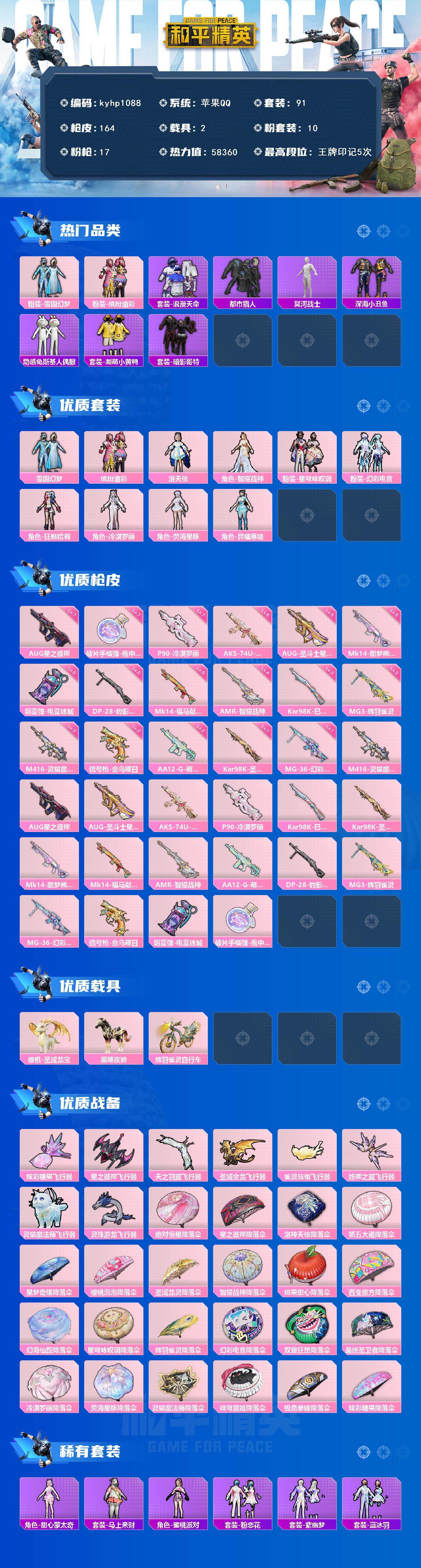 [17570804]苹果 手Q-10粉装-17特效枪-2载具-8粉色飞行器-58360热力值-5王牌印记-91套装-164枪皮 【热门品类】:粉装-雪国幻梦,粉装-缤纷油彩,套装-浪漫天命,套装-都市猎人,套装-冥河战士,套装-深海小丑鱼,套装-动感兔斯基人偶服,套装-潮萌小黄鸭,套装-暗影哥特 【粉色套装】:粉装-雪国幻梦,粉装-缤纷油彩,角色-洛天依,角色-智耀战神,粉装-星穹咏叹调,粉装-幻彩电音,角色-狂魅哈莉,角色-冷漠罗丽,角色-荧海星豚,角色-异瞳寒姬 【粉色枪皮等级】:M416-灵猫魔法师(三级),AUG-星之彼岸(七级),AUG-圣斗士星矢(五级),AKS-74U-星穹咏叹调(六级),P90-冷漠罗丽(七级),Kar98K-巳巳如意(三级),Kar98K-圣域龙灵(一级),Mk14-甜梦熊击(五级),Mk14-福马献瑞(五级),AMR-智耀战神(四级),AA12-G-萌骑幻想(二级),DP-28-豹影疾电(五级),MG3-辉羽雀灵(三级),MG-36-幻彩电音(一级),信号枪-金乌曜日(二级),烟雾弹-电雾迷城(五级),破片手榴弹-瓶中星球(七级) 【粉色载具】:僚机-圣域龙宝,黑曜夜骑,辉羽雀灵自行车 【粉色枪皮】:M416-灵猫魔法师,AUG-星之彼岸,AUG-圣斗士星矢,AKS-74U-星穹咏叹调,P90-冷漠罗丽,Kar98K-巳巳如意,Kar98K-圣域龙灵,Mk14-甜梦熊击,Mk14-福马献瑞,AMR-智耀战神,AA12-G-萌骑幻想,DP-28-豹影疾电,MG3-辉羽雀灵,MG-36-幻彩电音,信号枪-金乌曜日,烟雾弹-电雾迷城,破片手榴弹-瓶中星球 【粉色飞行器】:炫彩糖果飞行器,星之彼岸飞行器,天之羽翼飞行器,圣域金龙飞行器,雀灵庇佑飞行器,终晖之翼飞行器,灵猫魔法师飞行器,灵珠游龙飞行器 【粉色降落伞】:绝对恒星降落伞,星之彼岸降落伞,洛神天依降落伞,第五大道降落伞,星梦奇缘降落伞,樱桃泡泡降落伞,圣域龙灵降落伞,智耀战神降落伞,绯果甜心降落伞,百变魔方降落伞,幻海仙踪降落伞,星穹咏叹调降落伞,辉羽雀灵降落伞,幻彩电音降落伞,双重狂想降落伞,最终圣卫者降落伞,冷漠罗丽降落伞,荧海星豚降落伞,灵猫魔法师降落伞,绯穹魔姬降落伞,极意拳锋降落伞,炫彩糖果降落伞 【稀有套装】:角色-甜心蒙太奇,套装-雪国风尚,套装-炫彩糖果,套装-马上来财,角色-蜜桃