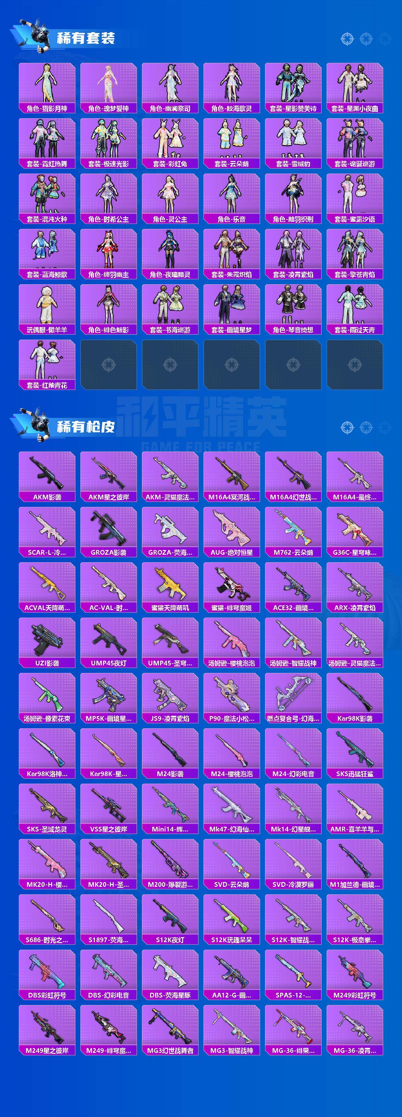 【粉色枪皮】:M416-灵猫魔法师,AUG-星之彼岸,AUG-圣斗士星矢,AKS-74U-星穹咏叹调,P90-冷漠罗丽,Kar98K-巳巳如意,Kar98K-圣域龙灵,Mk14-甜梦熊击,Mk14-福马献瑞,AMR-智耀战神,AA12-G-萌骑幻想,DP-28-豹影疾电,MG3-辉羽雀灵,MG-36-幻彩电音,信号枪-金乌曜日,烟雾弹-电雾迷城,破片手榴弹-瓶中星球