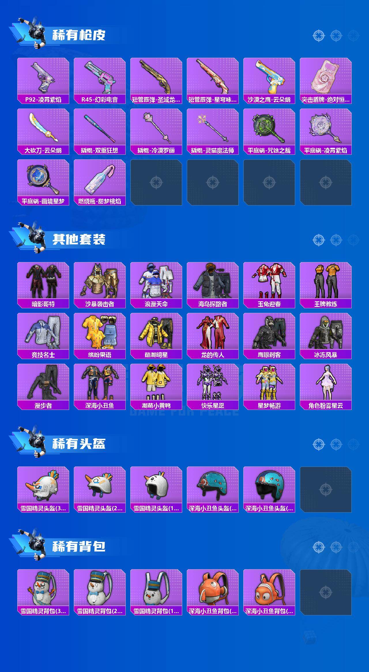 - [11526652]1红装 3粉装 5特效枪 8印记 可二次 可修改实名 优质装备:二级墨龙九天-敖渊(2级敖渊2级野人),墨龙九天-敖渊(野人),MG3梦幻舞会,AKM绿萝繁花,SCAR-L-锦绣绵绵,七级MG3-梦幻舞会,M416电玩时刻,M416墨龙九天 热门装扮:第五大道,繁龙极客,烟云彩露 五级特效枪:五级M416-电玩时刻,五级SCAR-L-锦绣绵绵,五级AKM-绿萝繁花 三级特效枪:三级M416-墨龙九天 紫色装扮:SS22特训,莱茵河畔,SS23特训,娇憨猪猪,萌趣咩咩,SS21特训,SS33特训套装,青涩时光,灵公主,SS20特训,SS15特训,SS14特训,都市漫游者,长空猛禽,霓虹街区,蓝色守护者,蓝色运动,魅力单车,鹤鸣,麻辣教官,龙的传人,龟仙人,柠萌假日,海岛探路者,涂山之恋,幻世战舞者,白熊同盟,破蛋小黄鸡,空岛之星,SS28特训,玉兔迎春,竞技名士,情公主,惊鸿侠骨,神气柴柴,懵萌河马,SS24特训(SS24特训套装),SS25特训,锦衣飞扬,焰鹰斗篷,幻羽潜行,幽夜迷踪,SS27特训,无暇誓言,华灯初上,SS26特训,春光漫游,快闪甜心,绯格组合,萌黄之夏 优质战备:墨龙九天降落伞,龙翔九天飞行器,江南烟雨降落伞,莲影清波降落伞,镜域双华降落伞,镜域双华-灵镜之阶,环太平洋降落伞,飒粉甜心降落伞,银刃赛罗降落伞
