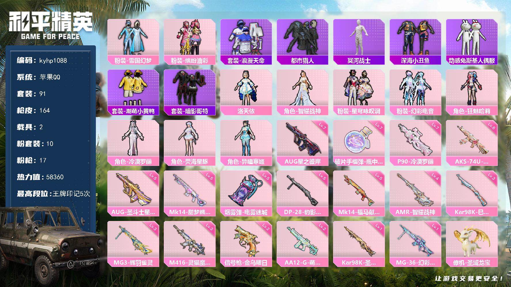 [17570804]苹果 手Q-10粉装-17特效枪-2载具-8粉色飞行器-58360热力值-5王牌印记-91套装-164枪皮