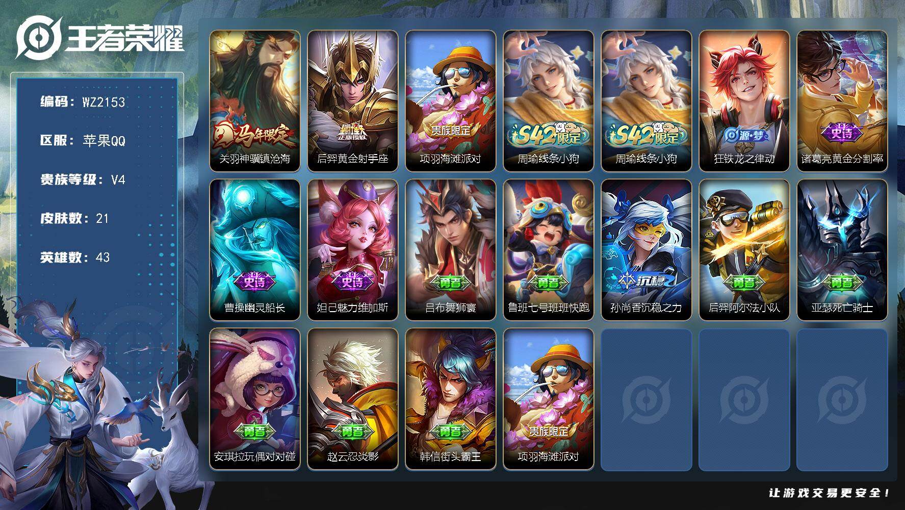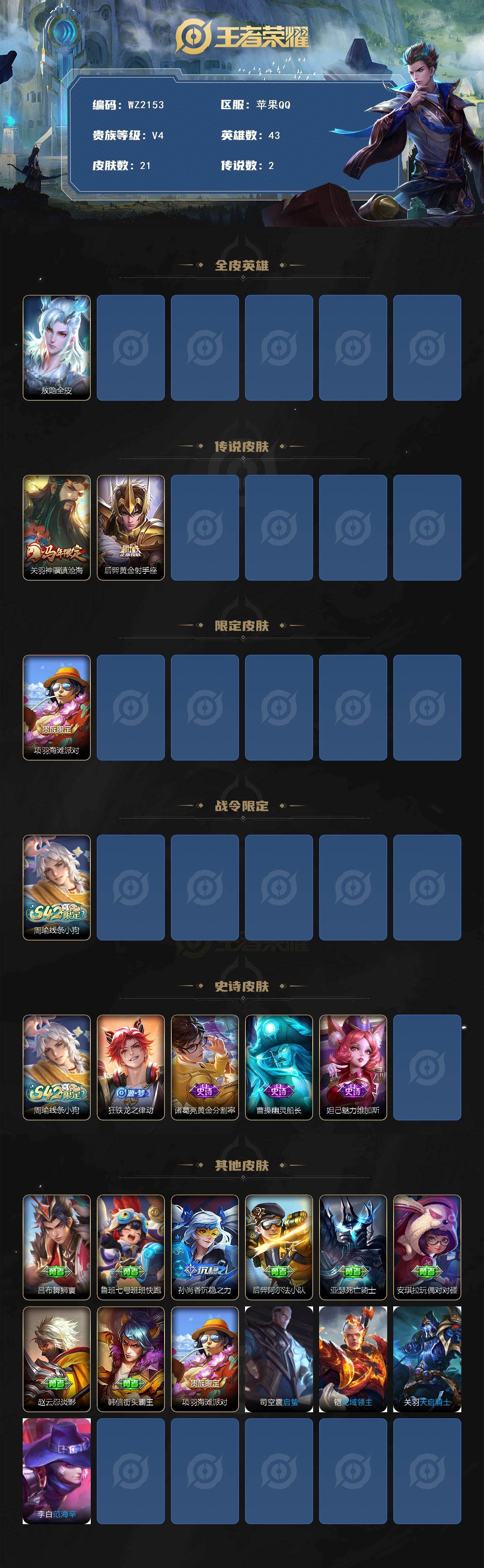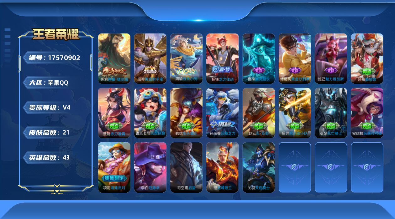 [17570902]苹果Q-21皮肤-2传说-4史诗 【英雄全皮】:敖隐全皮 【传说皮肤】:关羽神骥镇沧海,后羿黄金射手座 【限定皮肤】:项羽海滩派对 【战令限定】:周瑜线条小狗 【史诗皮肤】:周瑜线条小狗,狂铁龙之律动,诸葛亮黄金分割率,曹操幽灵船长,妲己魅力维加斯 【其他皮肤】:吕布舞狮寰,鲁班七号班班快跑,孙尚香沉稳之力,后羿阿尔法小队,亚瑟死亡骑士,安琪拉玩偶对对碰,赵云忍炎影,韩信街头霸王,项羽海滩派对,司空震启蛰,铠龙域领主,关羽天启骑士,李白范海辛 【营地ID】:1522571474