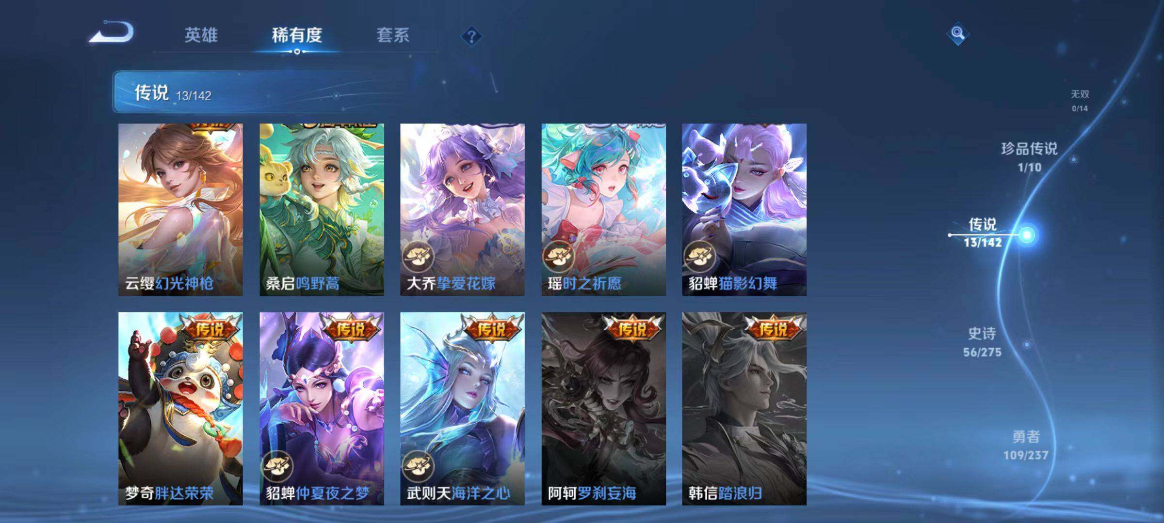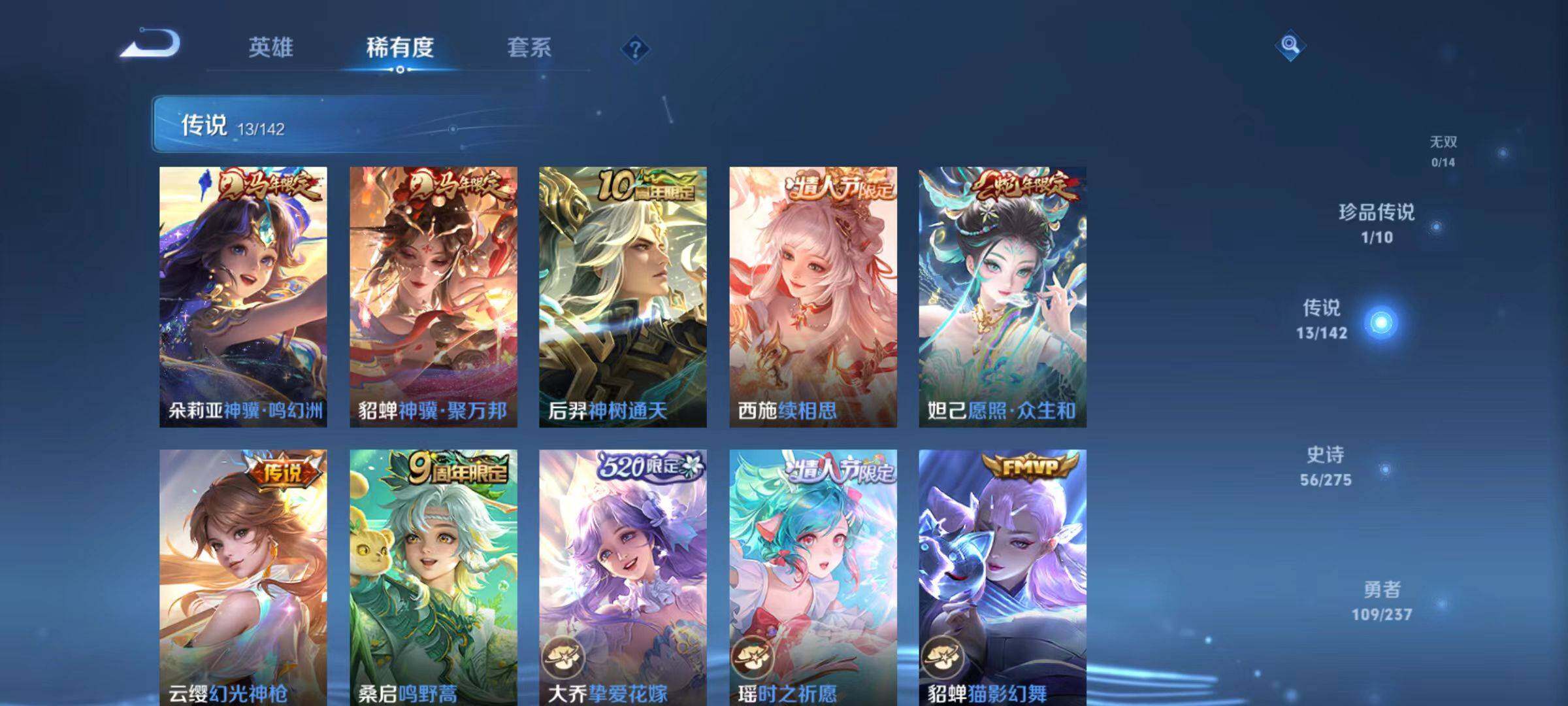 【传说皮肤】:朵莉亚神骥鸣幻洲,貂蝉神骥聚万邦,后羿神树通天,西施续相思,妲己愿照众生和,云缨幻光神枪,桑启鸣野蒿,大乔挚爱花嫁,瑶时之祈愿,貂蝉猫影幻舞,梦奇胖达荣荣,貂蝉仲夏夜之梦,武则天海洋之心