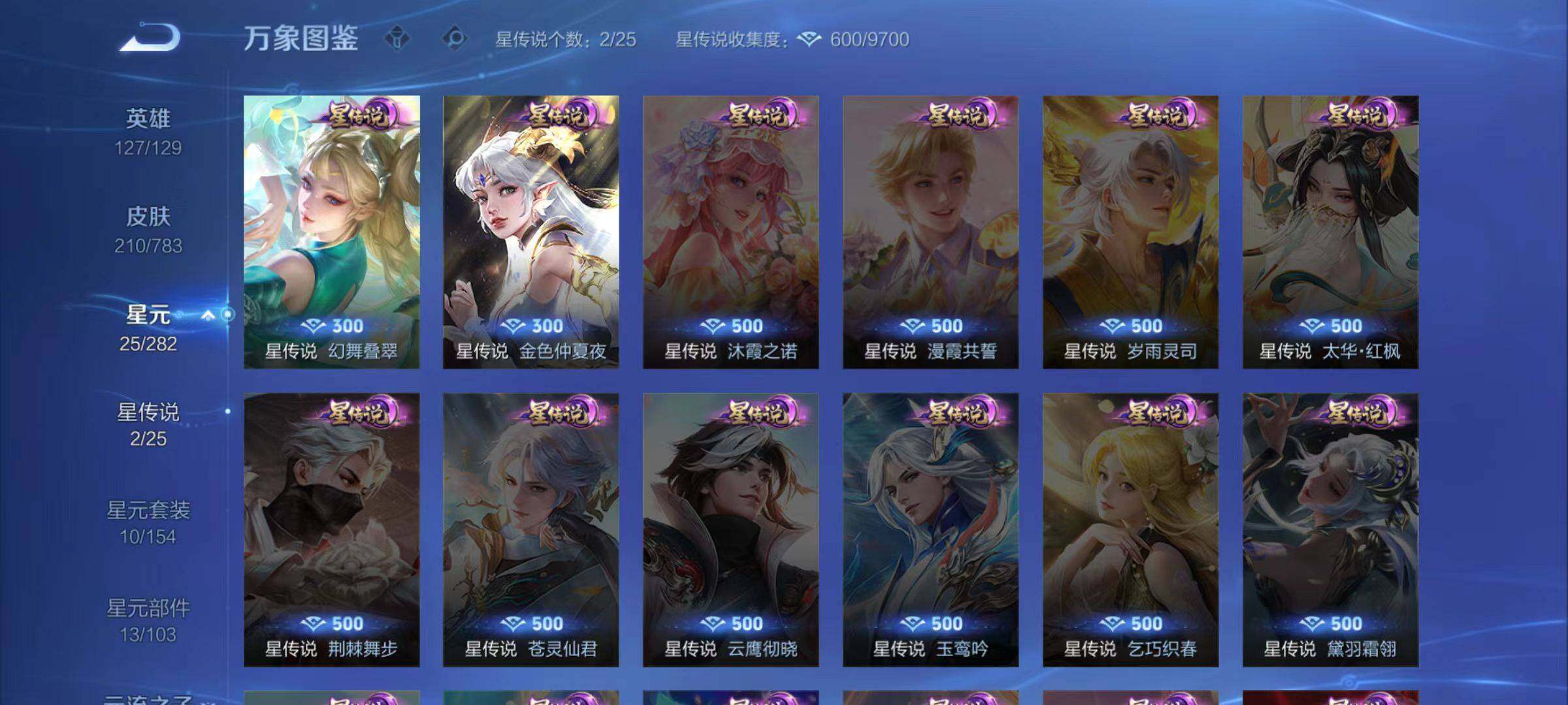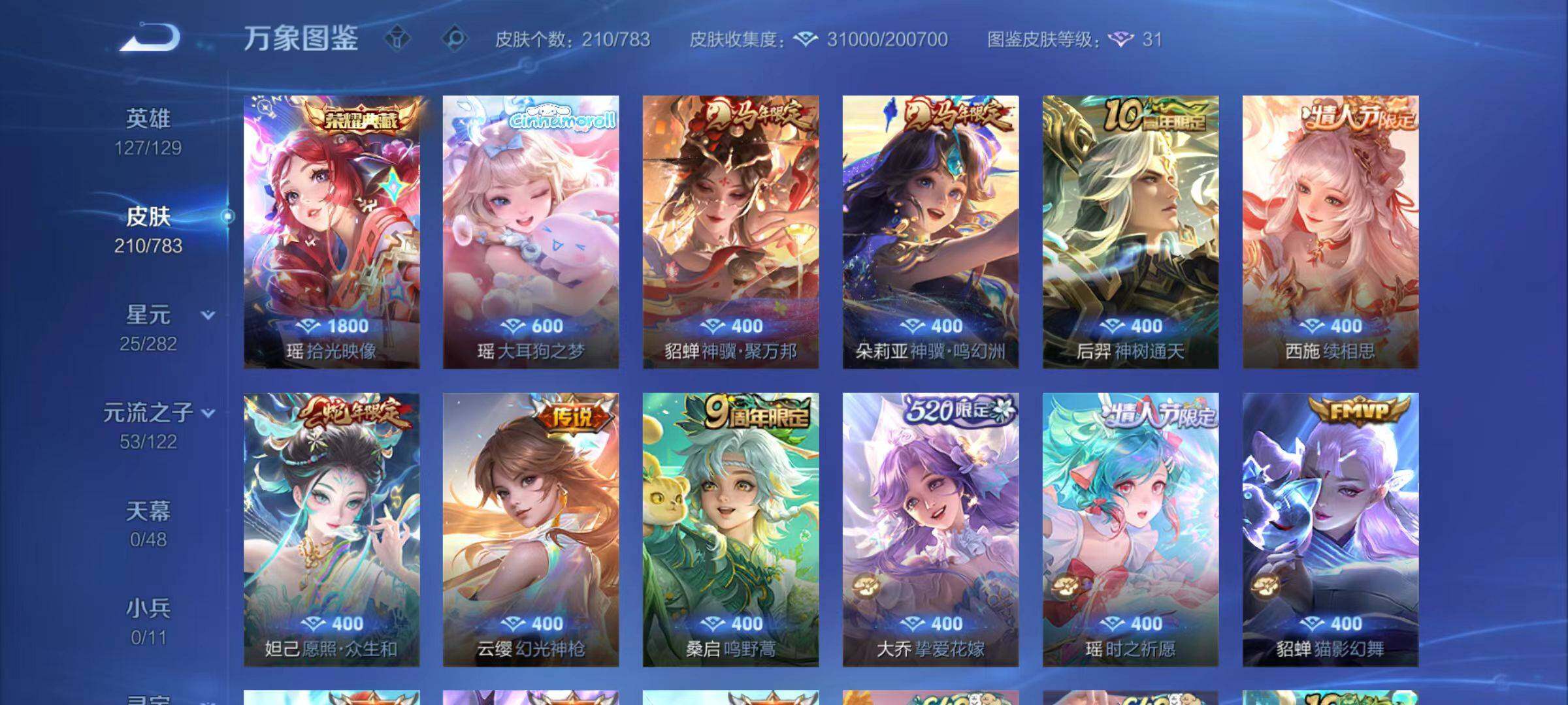 【史诗皮肤】:周瑜线条小狗,小乔线条小狗,少司缘巫礼祀神,扁鹊灵蛊蚀心,阿轲化蝶舞,狄仁杰绮世丹青,赵怀真器灵浮梦炉,少司缘涂山红红,蒙犽顽岩魄,安琪拉乘龙聚宝船,蒙恬荣光圣徽,妲己灵卜魔法,阿古朵江河有灵,百里守约真我赫兹,海月浮梦罗烟,瑶山海碧波行,元歌无心,鬼谷子五谷丰年,貂蝉唤灵魅影,嫦娥拒霜思,庄周高山流水,安琪拉时之奇旅,沈梦溪月团寄思,云中君纤云弄巧,裴擒虎李小龙,瑶遇见神鹿,小乔青蛇,大乔白蛇,蔡文姬繁星吟游,上官婉儿梁祝,狄仁杰鹰眼统帅,杨玉环遇见飞天,刘禅天才门将,蔡文姬舞动绿茵,百里守约特