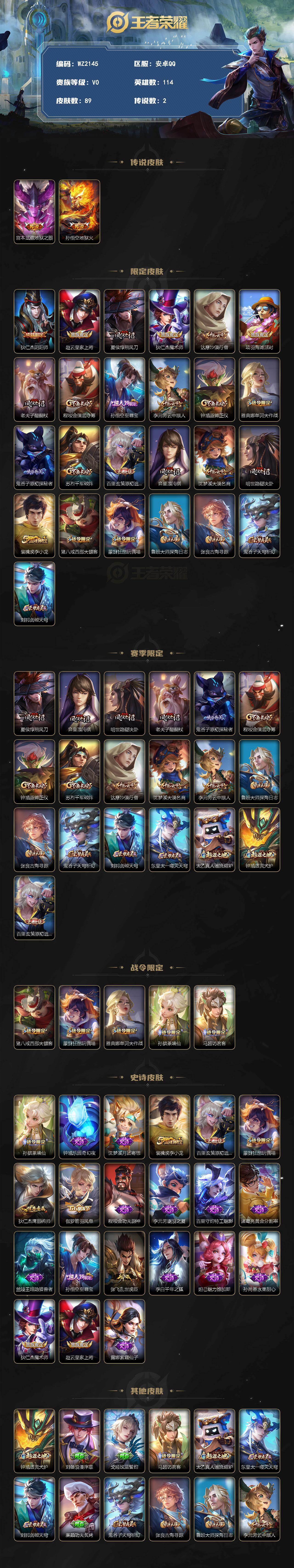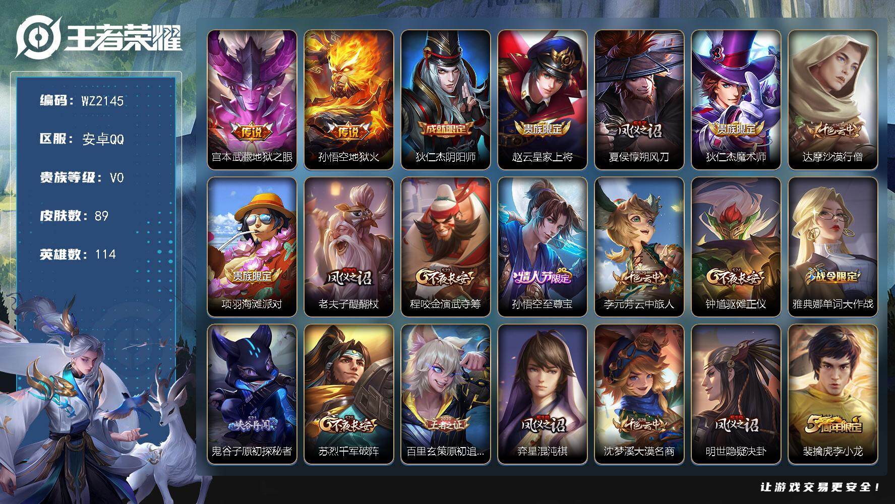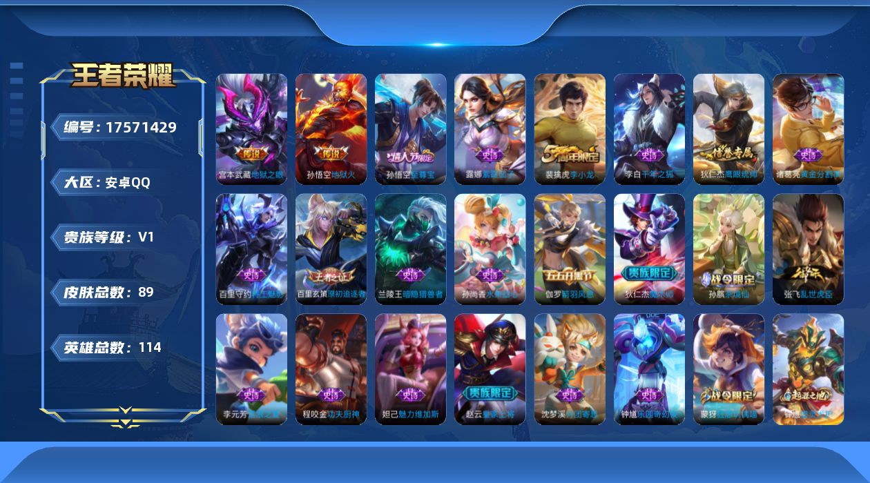 - [11607962]V9 2典藏 1无双 1珍品传说 29传说 124英雄 297皮肤 可修改实名 优质装备:全息碎影(猴子典藏),九霄神辉(木兰典藏),青丘·九尾(妲己无双),器灵·落星盏,黄金射手座,云鹰飞将(小将军),绛天战甲(鸡嘴战神),猫影幻舞,炽阳神光,一念神魔,末日机甲-孙尚香(绿蚂蚱),仲夏夜之梦(大飞蛾),零号·赤焰,地狱之眼,胖达荣荣,乞巧织情,淬星耀世,末日机甲-孙策,无双飞将,山海·炽霜斩(李信年限),山海·苍雷引(电光曜子),浮生妄,青丘·九尾,妄想奇谈 传说皮:续相思,星之鸣奏,幻光神枪 珍宝阁皮:玩趣恶龙 限定皮:愿照·岁时盈(虞姬年限),愿照·众生和(妲己年限),愿照·千秋盛(女娲年限),鸣野蒿,至尊宝,傲雪梅枪,神威(电光马子),飞衡(韩信年限),齐天大圣,降魔,五谷丰年,青龙志(铠年限),梁祝,御风骁将(吕布年限),龙胆,朱雀志(守约年限),孙行者,大圣娶亲,引擎之心,乒乒小将,美猴王,深海之息(深海大菠萝),山海·玄木吟(马可年限) 史诗皮:器灵·浮梦炉,龙之律动,紫霞仙子,苍穹之光,电玩小子(小书包),黄金分割率,特工魅影,千年之狐,永昼,江河有灵,百解令(蒙犽),蒙恬荣光圣徽,无限星赏官,冰冠公主,青蛇,偶像歌手,白蛇,晚萤,末日机甲-吕布,猫狗日记-孙策,猫狗日记-大乔,时之恋人-孙尚香,乱世虎臣,节奏热浪,修罗,女仆咖啡,摇滚巨星,水果甜心,绅士熊喵,天才门将,星夜王子,心灵骇客,功夫厨神,德古拉伯爵,暗隐猎兽者,幽灵船长,鬼剑武藏,心灵战警,舞动绿茵,地狱岩魂,缤纷独角兽,乘风破浪,逐浪之夏,月团寄思,水晶猎龙者,曙光守护者,箭羽风息,金属风暴,原初追逐者,圣诞狂欢,圣诞恋歌,鹰眼统帅,暗夜贵公子,魅力维加斯,赏金猎手,天秀·音浪,千筹问战,无心,未来纪元-赵云