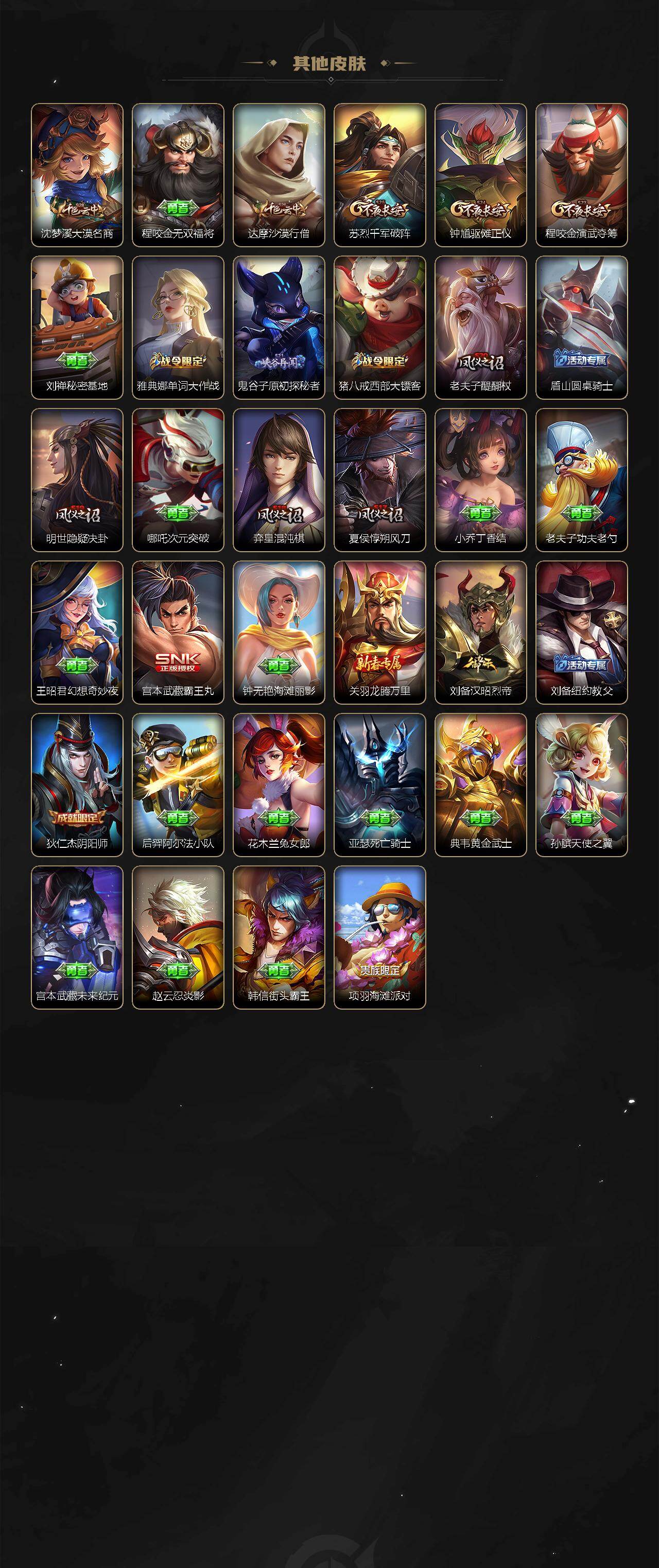 【其他皮肤】:钟馗虚灵犬护,刘备浪漫序章,戈娅玫蓝誓约,马超访茗客,太乙真人谧流熔炉,东皇太一噬灭天穹,刘邦剑破天穹,廉颇功夫炙烤,鬼谷子天穹祈灯,张良古海寻踪,鲁班大师探海日志,李元芳云中旅人,沈梦溪大漠名商,程咬金无双福将,达摩沙漠行僧,苏烈千军破阵,钟馗驱傩正仪,程咬金演武夺筹,刘禅秘密基地,雅典娜单词大作战,鬼谷子原初探秘者,猪八戒西部大镖客,老夫子醍醐杖,盾山圆桌骑士,明世隐疑决卦,哪吒次元突破,弈星混沌棋,夏侯惇朔风刀,小乔丁香结,老夫子功夫老勺,王昭君幻想奇妙夜,宫本武藏霸王丸,钟无艳海滩丽影,关羽龙腾万里,刘备汉昭烈帝,刘备纽约教父,狄仁杰阴阳师,后羿阿尔法小队,花木兰兔女郎,亚瑟死亡骑士,典韦黄金武士,孙膑天使之翼,宫本武藏未来纪元,赵云忍炎影,韩信街头霸王,项羽海滩派对,云缨赤焰之缨,司空震启蛰,镜冰刃幻境,马超幸存者,盘古创世神祝,李信灼热之刃,孙策海