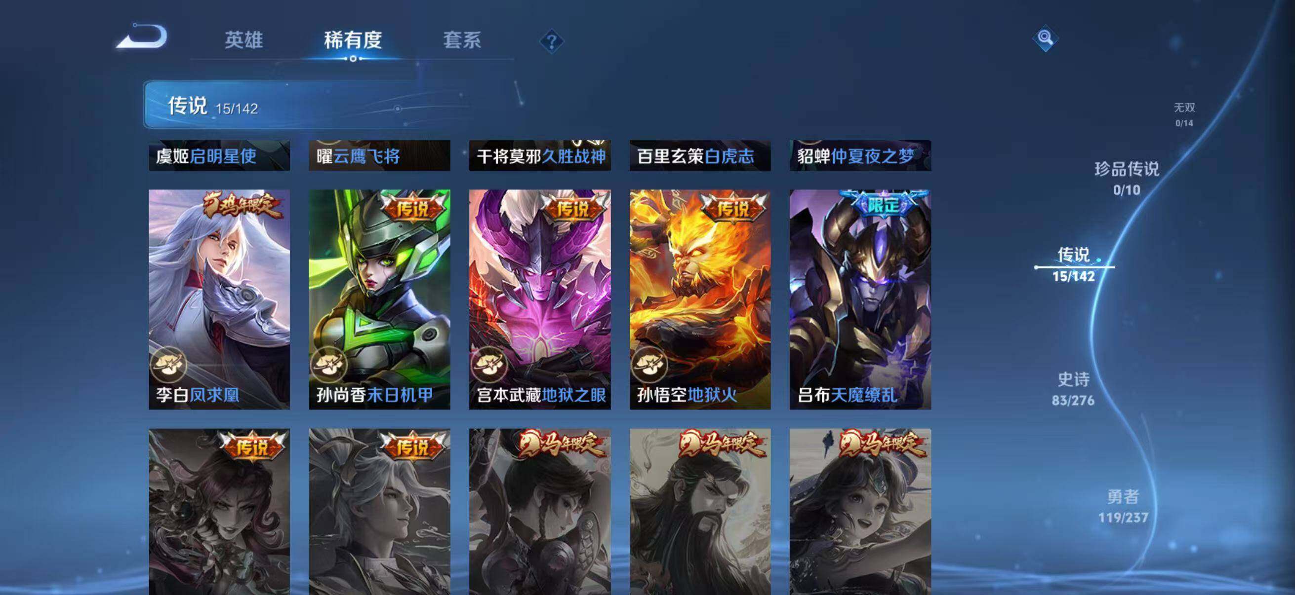 【赛季限定】:盾山御銮,夏侯惇朔风刀,弈星混沌棋,明世隐疑决卦,老夫子醍醐杖,鬼谷子原初探秘者,狄仁杰万华元夜,程咬金演武夺筹,钟馗驱傩正仪,苏烈千军破阵,达摩沙漠行僧,兰陵王金庭之子,沈梦溪大漠名商,李元芳云中旅人,桑启海盐诗旅,裴擒虎擒涛扼浪,鲁班大师探海日志,张良古海寻踪,鬼谷子天穹祈灯,刘邦剑破天穹,姜子牙天穹之誓,东皇太一噬灭天穹,钟馗虚灵犬护,甄姬逆浪荇歌,亚瑟荣光之誓,蒙恬荣光圣徽,牛魔星界战将