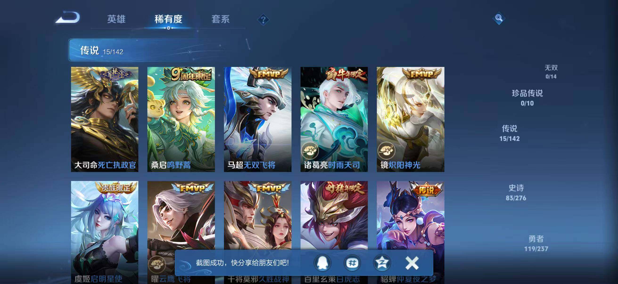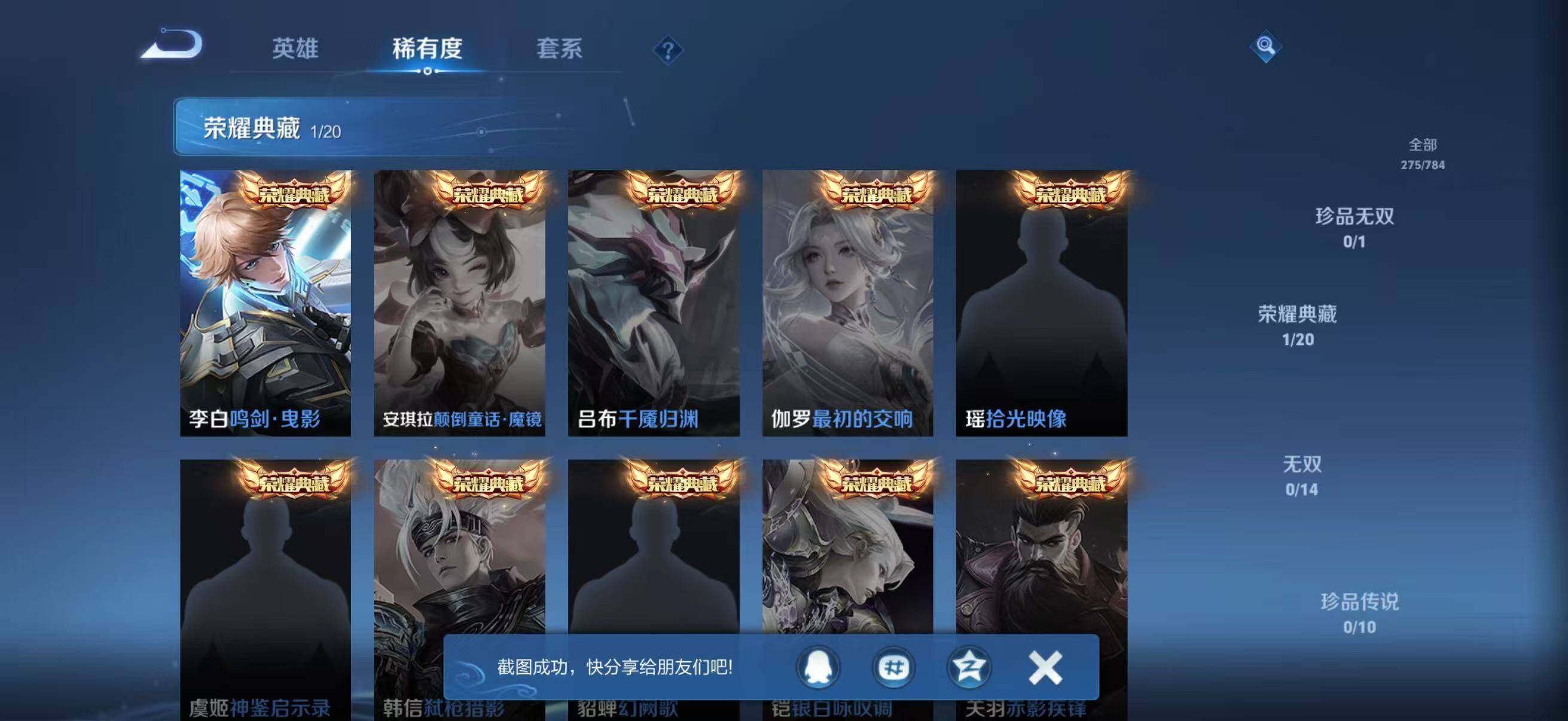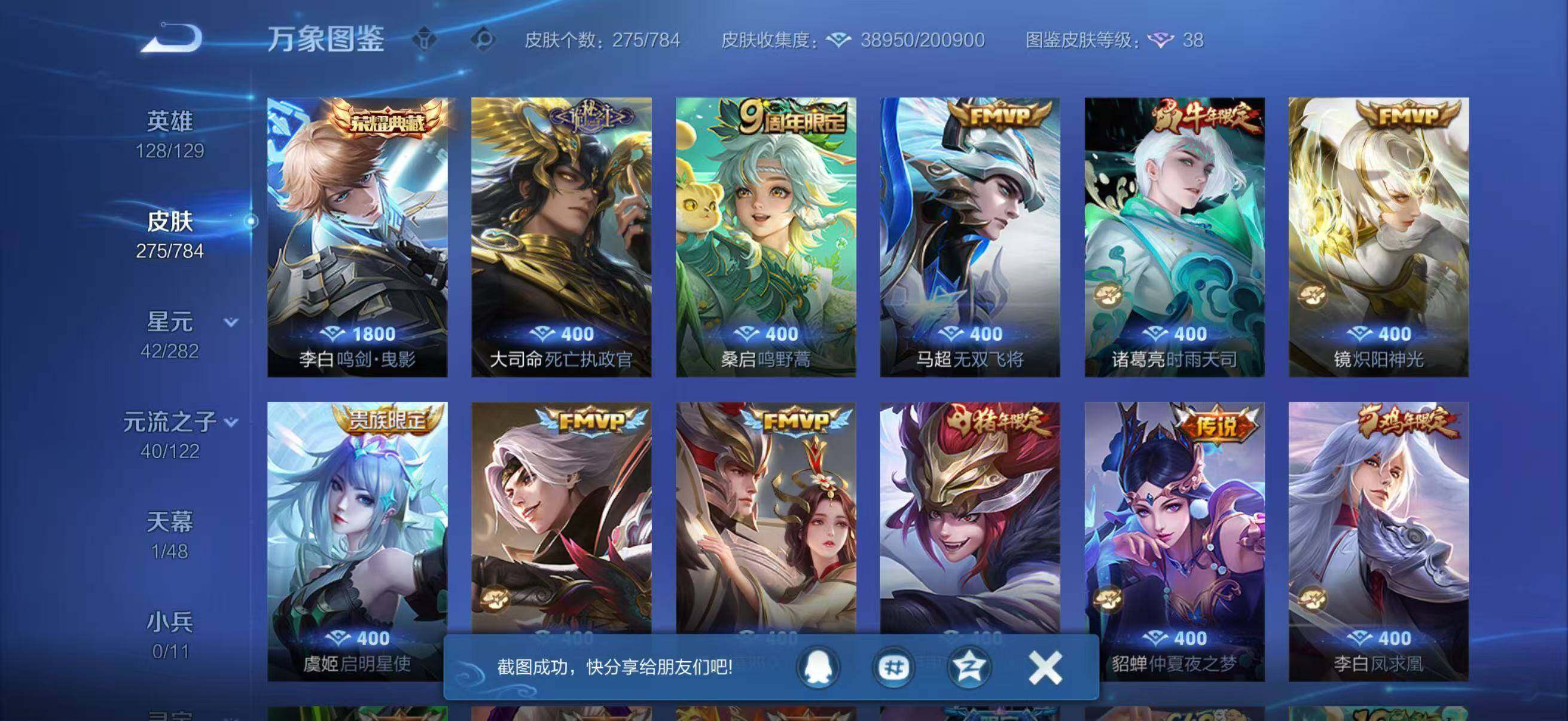 - [12635217]安卓Q-V6-永恒钻石I段位-123英雄-264皮肤-1典藏-0珍品无双-0无双-1珍品传说-8传说-71史诗 【荣耀典藏】:虞姬神鉴启示录 【珍品传说】:孙策时之奇旅 【内测皮肤】:嬴政优雅恋人,狂铁特工战影 【传说皮肤】:貂蝉仲夏夜之梦,曜云鹰飞将,马超无双飞将,李白诗剑行,澜电玩雷克斯,诸葛亮鹤羽星尊,澜逐花归海,桑启鸣野蒿 【限定皮肤】:暃埋骨钱,蒙犽顽岩魄,姜子牙天穹之誓,狄仁杰阴阳师,赵云皇家上将,嬴政优雅恋人,高渐离死亡摇滚,钟无艳超时空战士,扁鹊奇幻香踪,芈月幻夜卜梦,元歌云间偶戏,元歌无心,甄姬落雪兰心,狄仁杰魔术师,狄仁杰万华元夜,达摩沙漠行僧,项羽海滩派对,关羽百相守梦,程咬金演武夺筹,韩信傲雪梅枪,兰陵王金庭之子,亚瑟潮玩骑士王,刘备百相守梦,李元芳银河之约,李元芳云中旅人,钟馗驱傩正仪,杨戬潮玩骑兵,鬼谷子原初探秘者,鬼谷子五谷丰年,诸葛亮鹤羽星尊,黄忠火炮绅士,苏烈千军破阵,公孙离玉兔公主,沈梦溪大漠名商,明世隐疑决卦,裴擒虎李小龙,裴擒虎擒涛扼浪,云中君纤云弄巧,上官婉儿梁祝,嫦娥拒霜思,嫦娥暖冬兔眠,西施玲珑珍味,鲁班大师探海日志,桑启海盐诗旅,暃星界游侠,艾琳流音漫舞,赵怀真鹤归松栖,司空震地狱燃心,阿古朵江河有灵,张良古海寻踪,蒙犽百解令,高渐离燃音魔法,妲己灵卜魔法,鬼谷子天穹祈灯,姬小满妄想食味,沈梦溪龙舞盛年,刘邦剑破天穹,程咬金群星魔术团,镜青焰无极,项羽苍威无极,海诺心动手记,刘备异域游侠,芈月浮光幕影,周瑜熔金海岸 【赛季限定】:狄仁杰万华元夜,达摩沙漠行僧,程咬金演武夺筹,兰陵王金庭之子,张良古海寻踪,李元芳云中旅人,钟馗驱傩正仪,鬼谷子原初探秘者,苏烈千军破阵,沈梦溪大漠名商,明世隐疑决卦,裴擒虎擒涛扼浪,鲁班大师探海日志,桑启海盐诗旅,鬼谷子天穹祈灯,刘邦剑破天穹,姜子牙天穹之誓 【战令限定】:钟无艳超时空战士,扁鹊奇幻香踪,芈月幻夜卜梦,元歌云间偶戏,甄姬落雪兰心,艾琳流音漫舞,亚瑟潮玩骑士王,李元芳银河之约,杨戬潮玩骑兵,黄忠火炮绅士,嫦娥暖冬兔眠,西施玲珑珍味,司空震地狱燃心,暃星界游侠,高渐离燃音魔法,妲己灵卜魔法,镜青焰无极,项羽苍威无极 【史诗皮肤】:露娜紫霞仙子,赵云皇家上将,赵云未来纪元,貂蝉圣诞恋歌,甄姬冰雪圆舞曲,王昭君偶像歌手,狄仁杰魔术师,廉颇地狱岩魂,宫本武藏鬼剑武藏,孙尚香水果甜心,