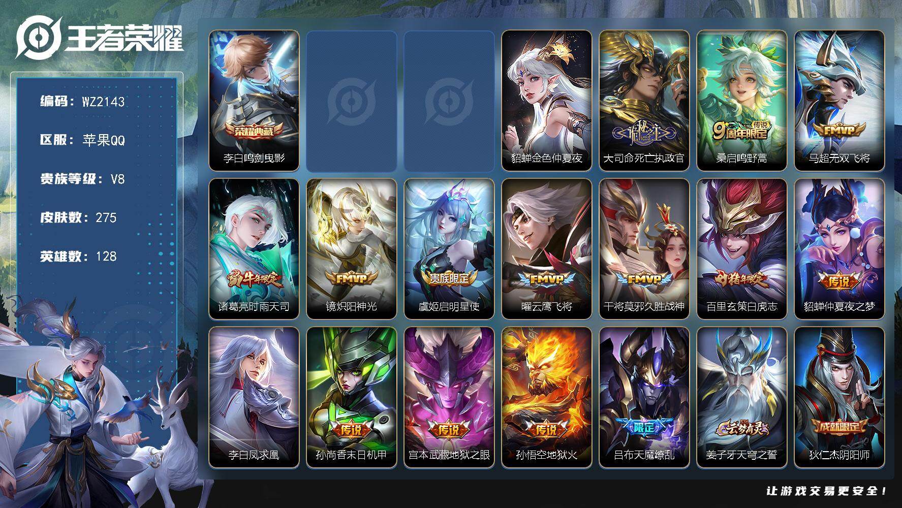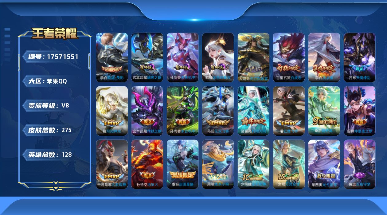 [17571551]苹果Q-V8-275皮肤-1典藏皮肤-15传说-81史诗 【英雄全皮】:孙权全皮,猪八戒全皮,敖隐全皮 【荣耀典藏】:李白鸣剑曳影 【传说皮肤】:大司命死亡执政官,桑启鸣野蒿,马超无双飞将,诸葛亮时雨天司,镜炽阳神光,虞姬启明星使,曜云鹰飞将,干将莫邪久胜战神,百里玄策白虎志,貂蝉仲夏夜之梦,李白凤求凰,孙尚香末日机甲,宫本武藏地狱之眼,孙悟空地狱火,吕布天魔缭乱 【限定皮肤】:姜子牙天穹之誓,狄仁杰阴阳师,赵云皇家上将,妲己时之彼端,嬴政优雅恋人,鲁班七号狮舞东方,庄周高山流水,阿轲迷踪丽影,吕布天魔缭乱,周瑜赤莲之焰,元歌云间偶戏,元歌无心,夏侯惇朔风刀,典韦岱宗,马可波罗暗影游猎,狄仁杰魔术师,狄仁杰万华元夜,达摩沙漠行僧,项羽海滩派对,老夫子醍醐杖,程咬金演武夺筹,刘邦夺宝奇兵,韩信飞衡,兰陵王驯魔猎人,兰陵王金庭之子,花木兰青春决赛季,亚瑟潮玩骑士王,孙悟空大圣娶亲,后羿如梦令,李元芳银河之约,李元芳云中旅人,虞姬启明星使,钟馗神迹守卫,钟馗驱傩正仪,雅典娜单词大作战,蔡文姬繁星吟游,鬼谷子原初探秘者,鬼谷子五谷丰年,诸葛亮时雨天司,苏烈千军破阵,百里玄策白虎志,弈星混沌棋,沈梦溪星空之诺,沈梦溪大漠名商,明世隐疑决卦,裴擒虎李小龙,裴擒虎擒涛扼浪,云中君纤云弄巧,盾山御銮,猪八戒西部大镖客,猪八戒猪悟能,上官婉儿梁祝,嫦娥拒霜思,蒙犽狂想玩偶喵,鲁班大师探海日志,桑启海盐诗旅,赵怀真鹤归松栖,阿古朵江河有灵,张良古海寻踪,蒙犽百解令,蒙恬荣光圣徽,鬼谷子天穹祈灯,姬小满妄想食味,沈梦溪龙舞盛年,鲁班七号蔬乡物语,李元芳蔬乡物语,刘邦剑破天穹 【年限皮肤】:李白凤求凰,百里玄策白虎志,典韦岱宗,韩信飞衡,诸葛亮时雨天司 【赛季限定】:盾山御銮,夏侯惇朔风刀,弈星混沌棋,明世隐疑决卦,老夫子醍醐杖,鬼谷子原初探秘者,狄仁杰万华元夜,程咬金演武夺筹,钟馗驱傩正仪,苏烈千军破阵,达摩沙漠行僧,兰陵王金庭之子,沈梦溪大漠名商,李元芳云中旅人,桑启海盐诗旅,裴擒虎擒涛扼浪,鲁班大师探海日志,张良古海寻踪,鬼谷子天穹祈灯,刘邦剑破天穹,姜子牙天穹之誓,东皇太一噬灭天穹,钟馗虚灵犬护,甄姬逆浪荇歌,亚瑟荣光之誓,蒙恬荣光圣徽,牛魔星界战将 【战令限定】:鲁班七号狮舞东方,钟馗神迹守卫,兰陵王驯魔猎人,周瑜赤莲之焰,李元芳银河之约,沈梦溪星空之诺,阿轲迷踪丽影,刘邦夺宝