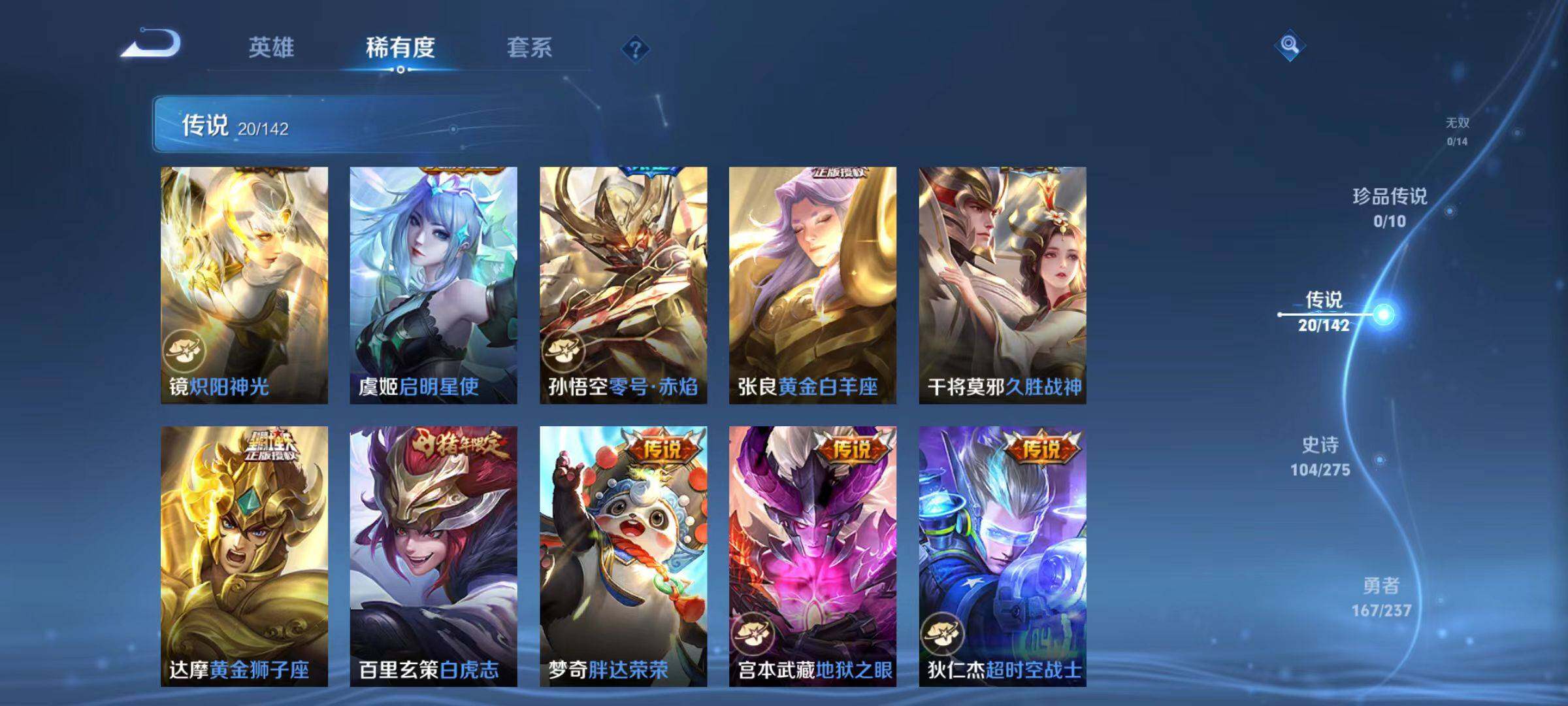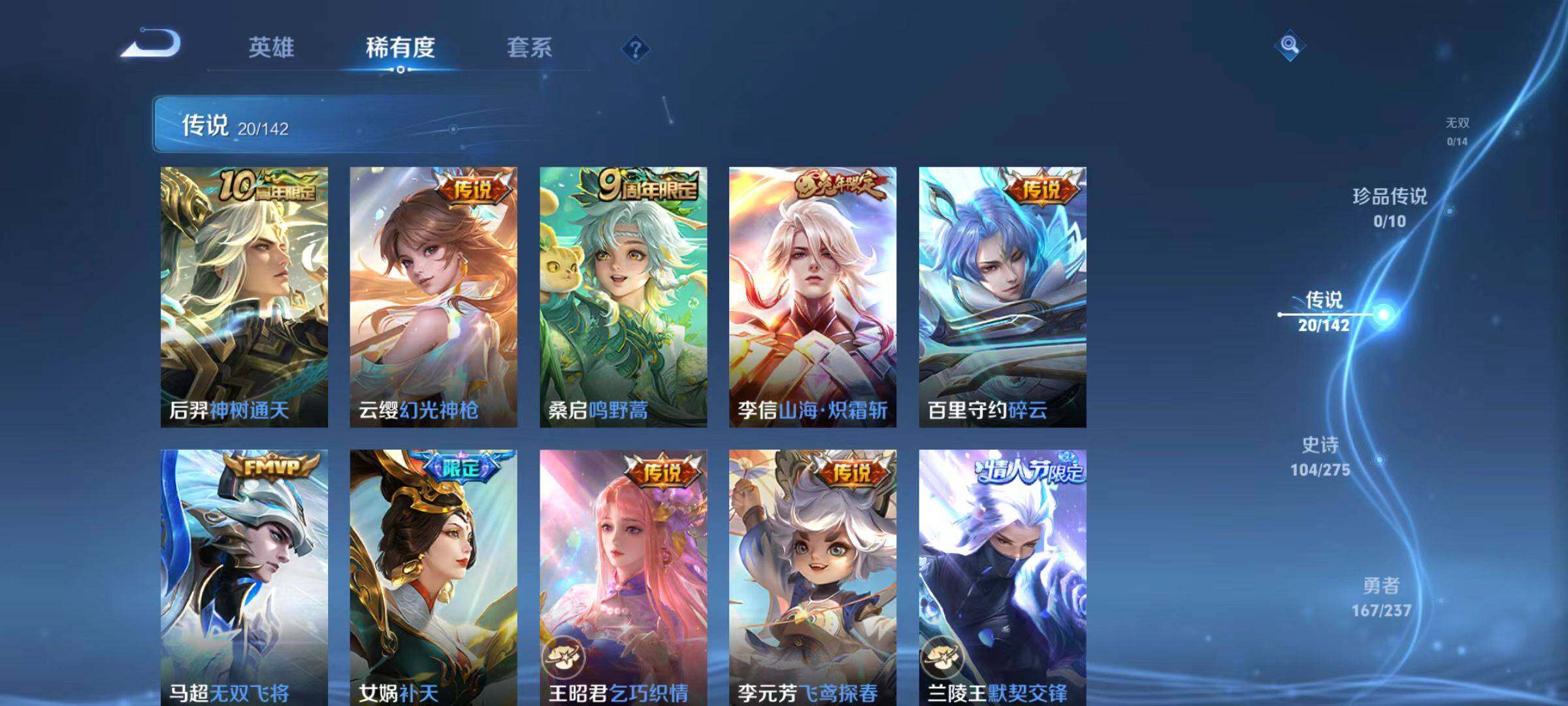 【传说皮肤】:后羿神树通天,云缨幻光神枪,桑启鸣野蒿,李信山海炽霜斩,百里守约碎云,马超无双飞将,女娲补天,王昭君乞巧织情,李元芳飞鸢探春,兰陵王默契交锋,镜炽阳神光,虞姬启明星使,孙悟空零号赤焰,张良黄金白羊座,干将莫邪久胜战神,达摩黄金狮子座,百里玄策白虎志,梦奇胖达荣荣,宫本武藏地狱之眼,狄仁杰超时空战士