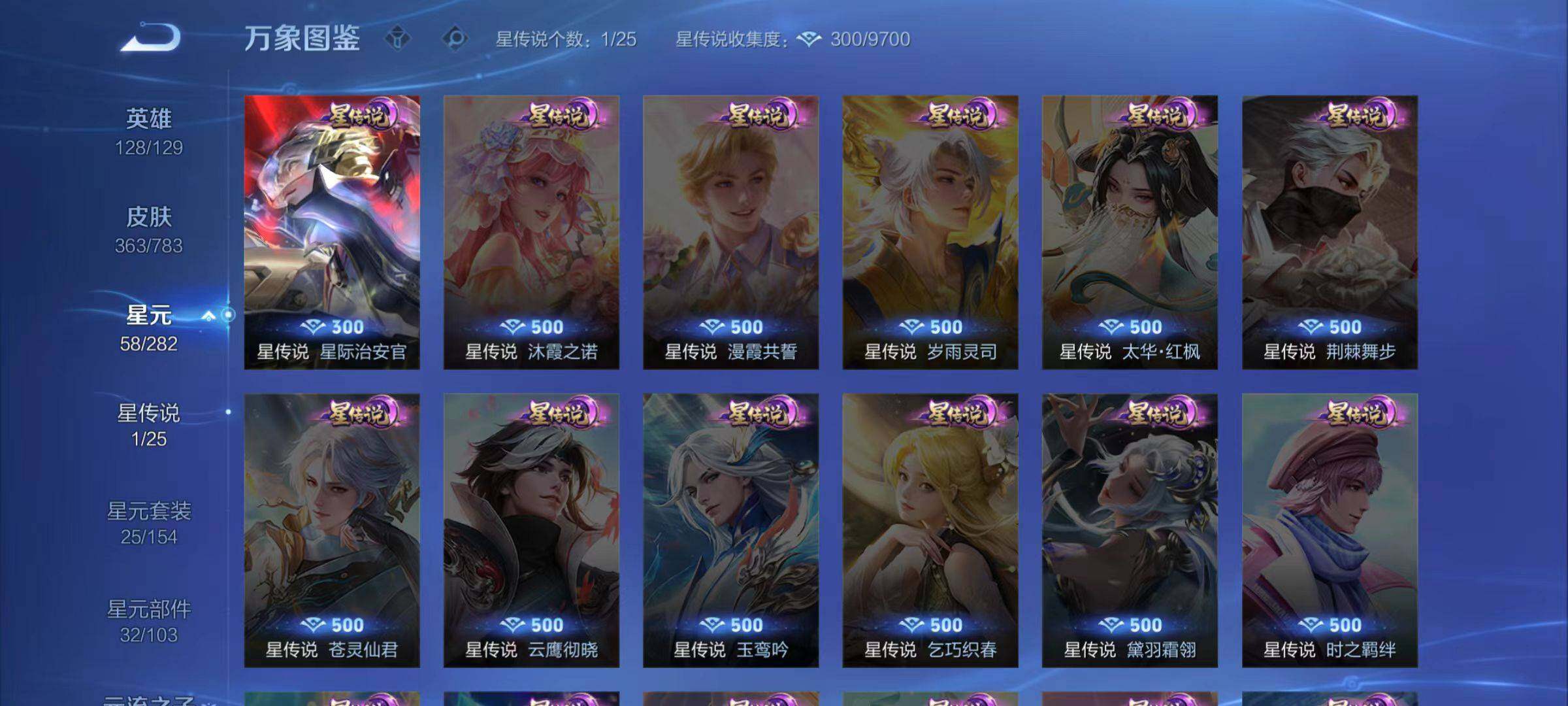 裴擒虎李小龙,上官婉儿梁祝,牛魔奔雷神使,马超神威,后羿辉光之辰,裴擒虎天狼狩猎者,上官婉儿天狼绘梦者,伽罗天狼溯光者,马可波罗逐梦之星,百里玄策白虎志,百里守约朱雀志,孙悟空大圣娶亲,花木兰默契交锋,兰陵王默契交锋,妲己时之彼端,赵云引擎之心,大乔白鹤梁神女,孙膑寅虎·展翼,女娲补天,桑启鸣野蒿