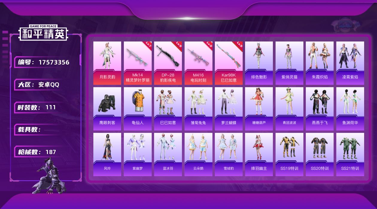 [17573356]安卓 手Q-1粉装-5特效枪-0载具-0粉色飞行器-48421热力值-6王牌印记-111套装-187枪皮 【热门品类】:套装-龟仙人 【粉色套装】:角色-月影灵韵 【粉色枪皮等级】:M416-电玩时刻(五级),AKS-74U-森灵之息(五级),Kar98K-巳巳如意(五级),Mk14-精灵梦叶罗丽(七级),DP-28-豹影疾电(五级) 【粉色枪皮】:M416-电玩时刻,AKS-74U-森灵之息,Kar98K-巳巳如意,Mk14-精灵梦叶罗丽,DP-28-豹影疾电 【粉色降落伞】:垂柳戏鸭降落伞,仲夏莫吉托降落伞,雪月幻音降落伞,幻彩电音降落伞,喜羊羊与灰太狼降落伞,炫彩糖果降落伞 【稀有套装】:套装-龟仙人,套装-巳巳如意,套装-雏菊兔兔,套装-萝兰蝴蝶,套装-糖糖葫芦,套装-青团波波,套装-燕燕于飞,套装-鱼渊荷华,角色-风玲,套装-紫幽梦,套装-蓝冰羽,套装-云朵鹅,套装-雪绒豹,角色-绛羽幽主,套装-朱霞炽焰,套装-凌霄紫焰,角色-绯色魅影,角色-紫俏灵猫 【稀有枪皮】:AKM-彩虹符号,AKM-灼热熔岩,AKM-破晓战魂,AKM-龙的传人,M16A4-幻世战舞者,M16A4-甜心亚梦,SCAR-L-夜灯,SCAR-L-玉兔迎春,SCAR-L-红色方程式,M416-糯团青竹,M416-红色方程式,M416-蓝色火焰,GROZA-彩虹符号,GROZA-田园牧歌,AUG-甜蜜菠萝,AUG-耀粉歌者,QBZ-洛神天依,M762-天降萌叽,M762-彩虹符号,M762-云朵鹅,Mk47-妙红点点,AC-VAL-天降萌叽,AC-VAL-快闪甜心,AC-VAL-甜心亚梦,蜜獾-垂柳戏鸭,蜜獾-天降萌叽,蜜獾-娇憨猪猪,ARX-凌霄紫焰,UZI-天降萌叽,UZI-娇憨猪猪,UZI-红色方程式,UMP45-涂山之恋,UMP45-生命誓言,UMP45-蓝色火焰,Vector-焰鹰斗篷,Vector-生命誓言,Vector-田园牧歌,Vector-创世·救赎,汤姆逊-天降萌叽,汤姆逊-奇异狩猎者,汤姆逊-炫彩节奏,汤姆逊-耀粉歌者,JS9-凌霄紫焰,P90-快闪甜心,P90-飞驰魅影,P90-巳巳如意,Kar98K-炫彩节奏,Kar98K-王子的夏天,AWM-焰鹰斗篷,VSS-彩虹符号,VSS-田园牧歌,Mini14-耀粉歌者,Mini14-绯穹魔姬,SLR-娇憨猪猪,SLR-