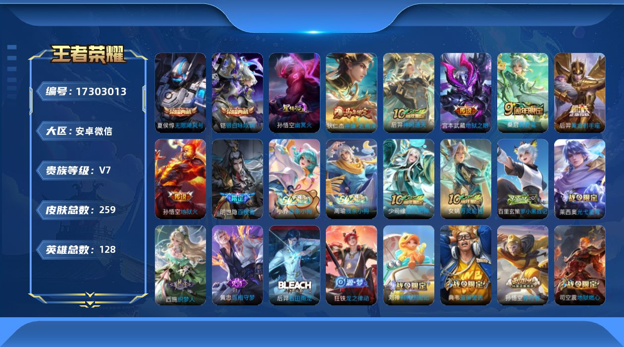 [17303013]安卓WX-V7-至尊星耀III段位-128英雄-259皮肤-2典藏皮肤-6传说-74史诗