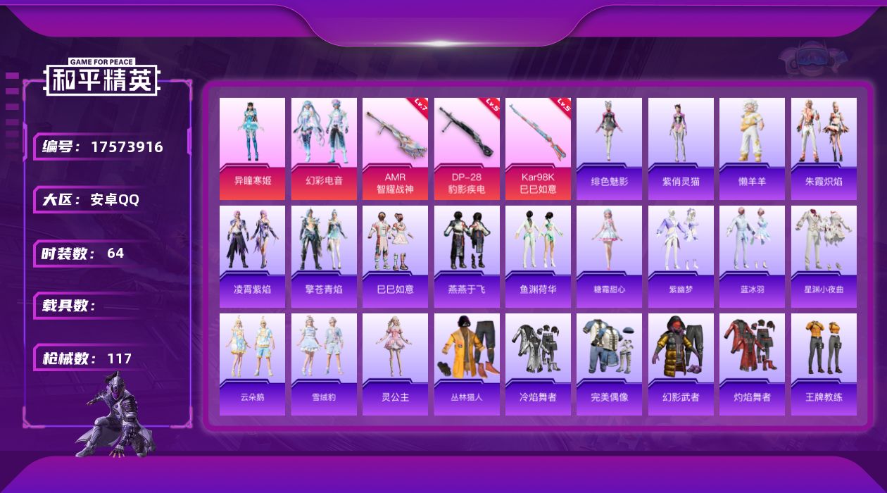 [17573916]安卓 手Q-3粉装-6特效枪-0载具-2粉色飞行器-30540热力值-3王牌印记-64套装-117枪皮 【粉色套装】:粉装-幻彩电音,角色-异瞳寒姬,角色-罪夜之冕 【粉色枪皮等级】:AKS-74U-森灵之息(五级),Kar98K-巳巳如意(五级),AMR-智耀战神(七级),DP-28-豹影疾电(五级) 【粉色枪皮】:AKS-74U-森灵之息,Kar98K-巳巳如意,Mk14-福马献瑞,AMR-智耀战神,DP-28-豹影疾电 【粉色飞行器】:炫彩糖果飞行器,极意拳锋飞行器 【粉色降落伞】:星之彼岸降落伞,临安公主降落伞,雪月幻音降落伞,星穹咏叹调降落伞,幻星舰长降落伞,炫彩糖果降落伞 【稀有套装】:套装-巳巳如意,套装-雪国风尚,套装-炫彩糖果,套装-燕燕于飞,套装-鱼渊荷华,角色-糖霜甜心,套装-紫幽梦,套装-蓝冰羽,套装-星渊小夜曲,套装-云朵鹅,套装-雪绒豹,角色-灵公主,套装-朱霞炽焰,套装-凌霄紫焰,套装-擎苍青焰,玩偶服-懒羊羊,角色-绯色魅影,角色-紫俏灵猫,角色-月烬之祷,套装-雨过天青,套装-红釉青花 【稀有枪皮】:AUG-冰晶雪宝,AKM-星之彼岸,AKM-龙的传人,SCAR-L-夜灯,SCAR-L-红色方程式,M416-蓝色火焰,AUG-耀粉歌者,AUG-月影灵韵,M762-天降萌叽,M762-云朵鹅,G36C-星穹咏叹调,ARX-凌霄紫焰,UZI-啾咪啾咪,UZI-天降萌叽,UMP45-夜灯,UMP45-春暖花开,UMP45-生命誓言,UMP45-极意拳锋,Vector-生命誓言,汤姆逊-耀粉歌者,JS9-凌霄紫焰,P90-巳巳如意,Kar98K-星穹咏叹调,VSS-星之彼岸,Mini14-春暖花开,AMR-喜羊羊与灰太狼,SVD-云朵鹅,S686-巳巳如意,S12K-夜灯,DBS-幻彩电音,SPAS-12-云朵鹅,M249-星之彼岸,M249-糯团青竹,MG3-幻世战舞者,MG-36-凌霄紫焰,P92-凌霄紫焰,短管霰弹-星穹咏叹调,沙漠之鹰-云朵鹅,大砍刀-云朵鹅,平底锅-凌霄紫焰,破片手榴弹-巳巳如意 【其他套装】:套装-丛林猎人,套装-冷焰舞者,套装-完美偶像,套装-幻影武者,套装-灼焰舞者,套装-王牌教练,套装-白色伏地魔,套装-竞技名士,套装-长空猛禽,套装-青年教官,套装-青涩时光,套装-青羽突袭者,套装-魅力单车,套装-黑色