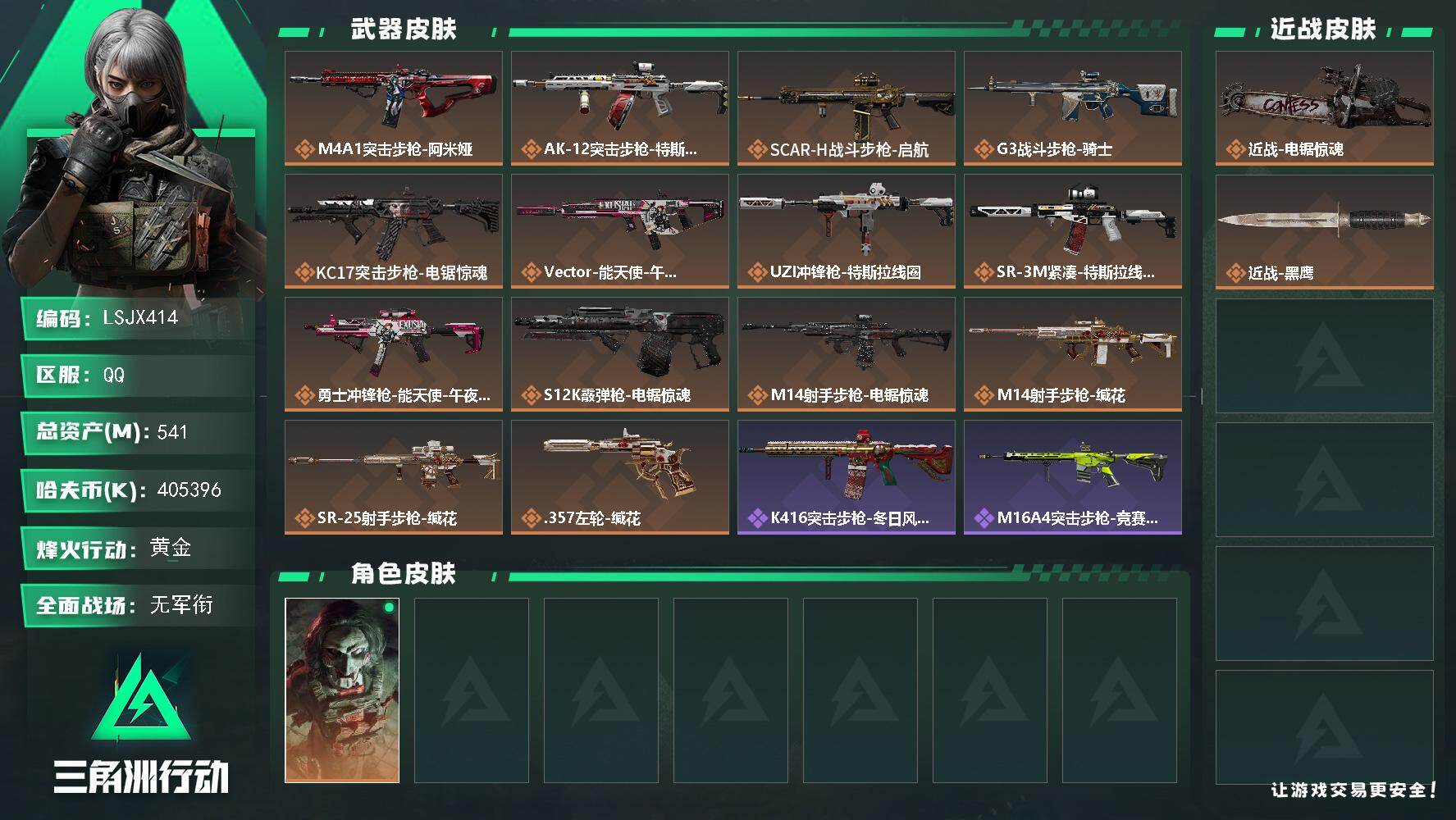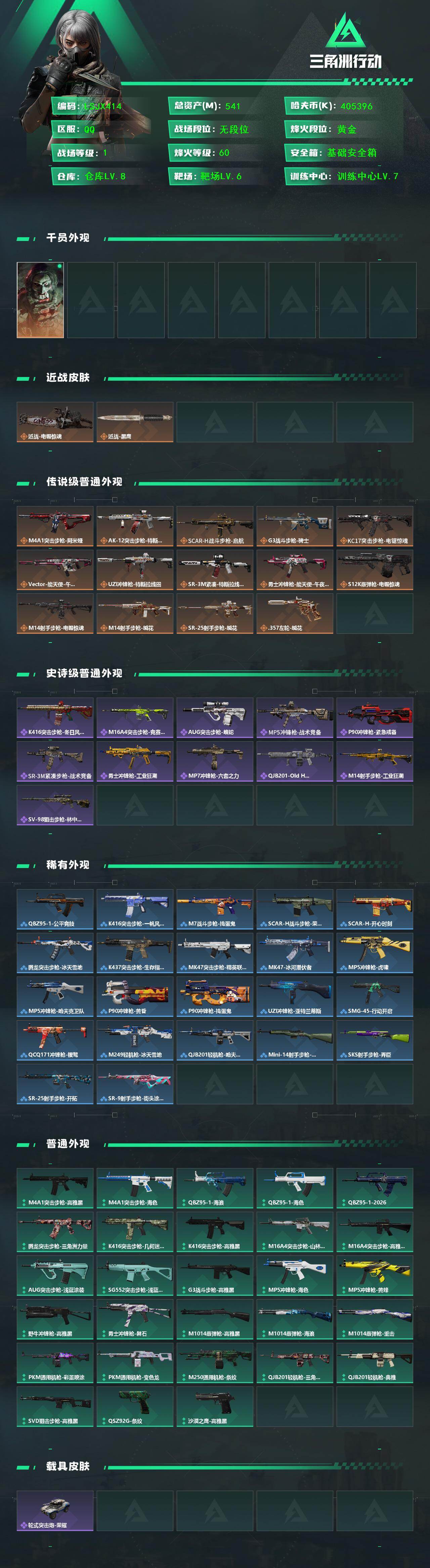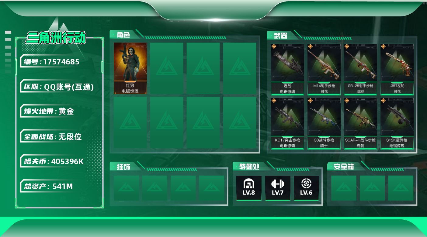 [17574685]【特价出售/店主推荐】541m总资产-405396k哈伏币-60烽火等级-黄金-1战场等级-无军衔 【干员外观】:红狼-电锯惊魂 【近战皮肤】:近战-电锯惊魂,近战-黑鹰 【传说外观】:M4A1突击步枪-阿米娅,AK-12突击步枪-特斯拉线圈,SCAR-H战斗步枪-启航,G3战斗步枪-骑士,KC17突击步枪-电锯惊魂,Vector冲锋枪-能天使-午夜邮差,UZI冲锋枪-特斯拉线圈,SR-3M紧凑突击步枪-特斯拉线圈,勇士冲锋枪-能天使-午夜邮差,S12K霰弹枪-电锯惊魂,M14射手步枪-电锯惊魂,M14射手步枪-缄花,SR-25射手步枪-缄花,.357左轮-缄花 【史诗外观】:K416突击步枪-冬日风情,M16A4突击步枪-竞赛选手,AUG突击步枪-蝮蛇,MP5冲锋枪-战术竞备,P90冲锋枪-紧急戒备,SR-3M紧凑突击步枪-战术竞备,勇士冲锋枪-工业狂潮,MP7冲锋枪-六套之力,QJB201轻机枪-Old Habits,M14射手步枪-工业狂潮,SV-98狙击步枪-林中猎手 【稀有外观】:QBZ95-1突击步枪-公平竞技,K416突击步枪-一帆风顺,M7战斗步枪-捣蛋鬼,SCAR-H战斗步枪-荣耀列队,SCAR-H战斗步枪-开心时刻,腾龙突击步枪-冰天雪地,K437突击步枪-生存指令,MK47突击步枪-精英联盟,MK47突击步枪-冰河潜伏者,MP5冲锋枪-虎啸,MP5冲锋枪-哈夫克卫队,P90冲锋枪-黄昏,P90冲锋枪-捣蛋鬼,UZI冲锋枪-亚特兰蒂斯,SMG-45冲锋枪-行动开启,QCQ171冲锋枪-银鹭,M249轻机枪-冰天雪地,QJB201轻机枪-哈夫克卫队,Mini-14射手步枪-荣耀列队,SKS射手步枪-弄臣,SR-25射手步枪-开拓,SR-9射手步枪-街头涂鸦 【普通外观】:M4A1突击步枪-高雅黑,M4A1突击步枪-海色,QBZ95-1突击步枪-海浪,QBZ95-1突击步枪-海色,QBZ95-1突击步枪-2026,腾龙突击步枪-三角洲力量,K416突击步枪-几何迷彩,K416突击步枪-高雅黑,M16A4突击步枪-山林猎人,M16A4突击步枪-高雅黑,AUG突击步枪-浅蓝涂装,SG552突击步枪-浅蓝涂装,G3战斗步枪-高雅黑,MP5冲锋枪-海色,MP5冲锋枪-黄蜂,野牛冲锋枪-高雅黑,勇士冲锋枪-磐石,M1014霰弹枪-高雅黑,M1014霰弹枪-海