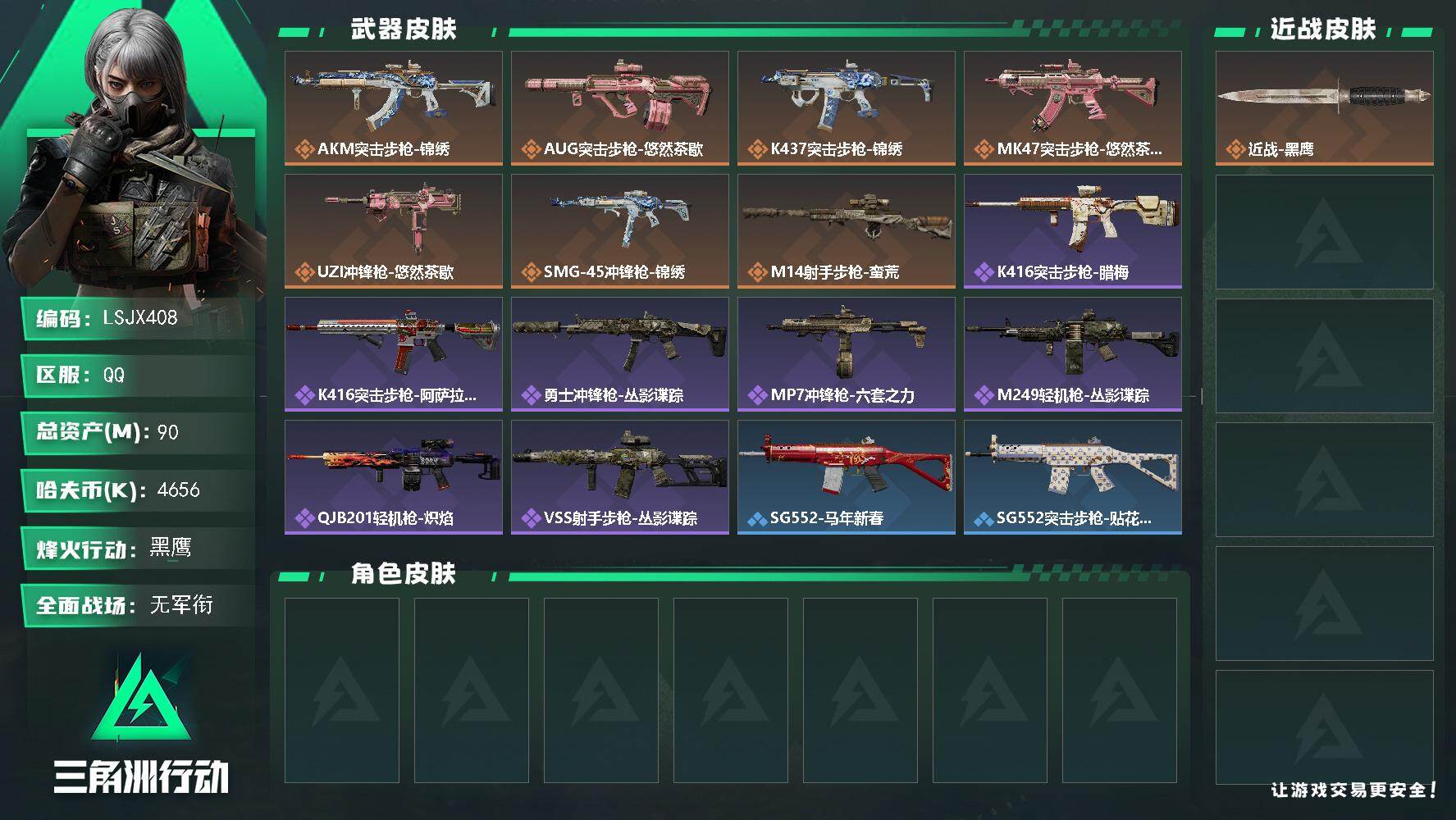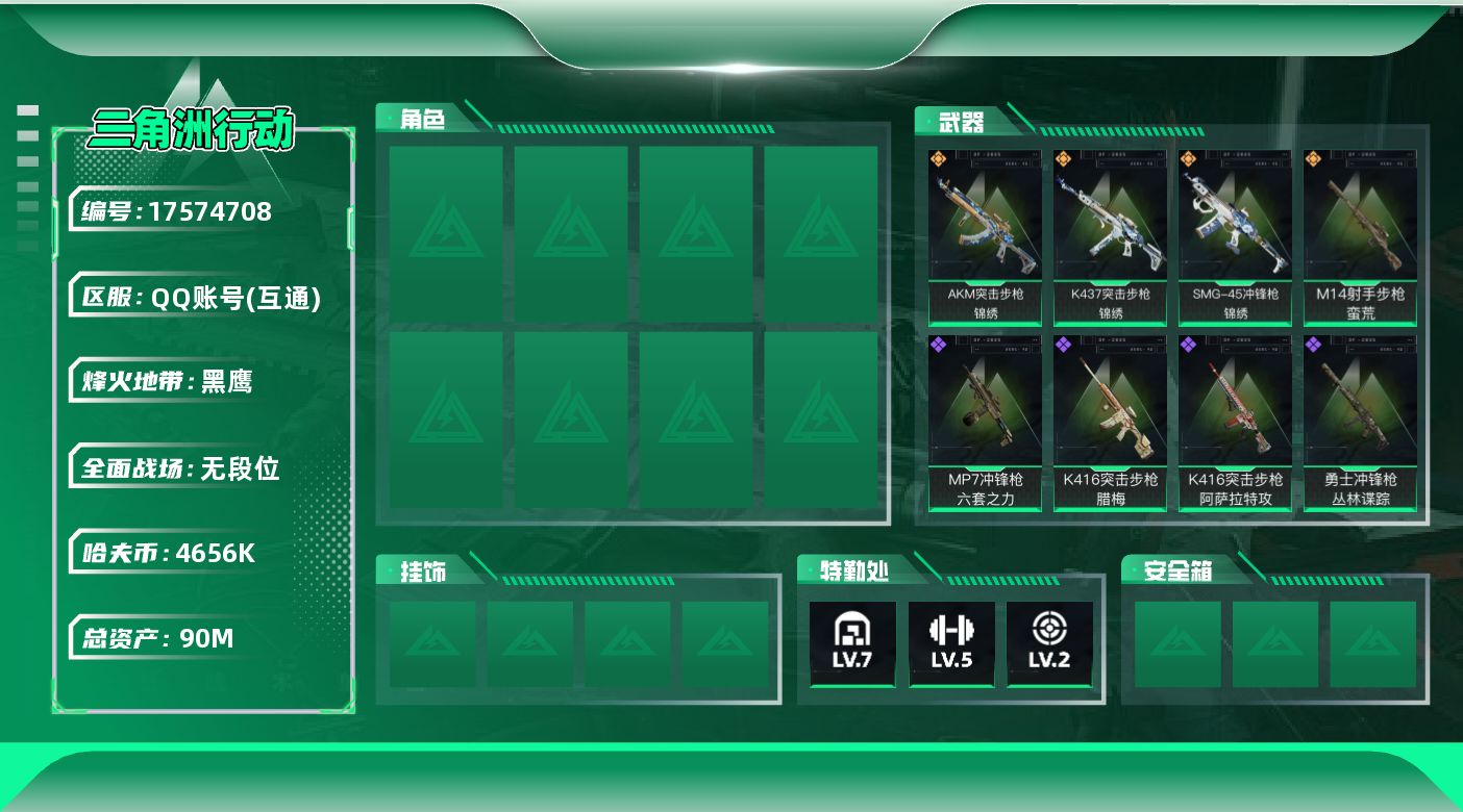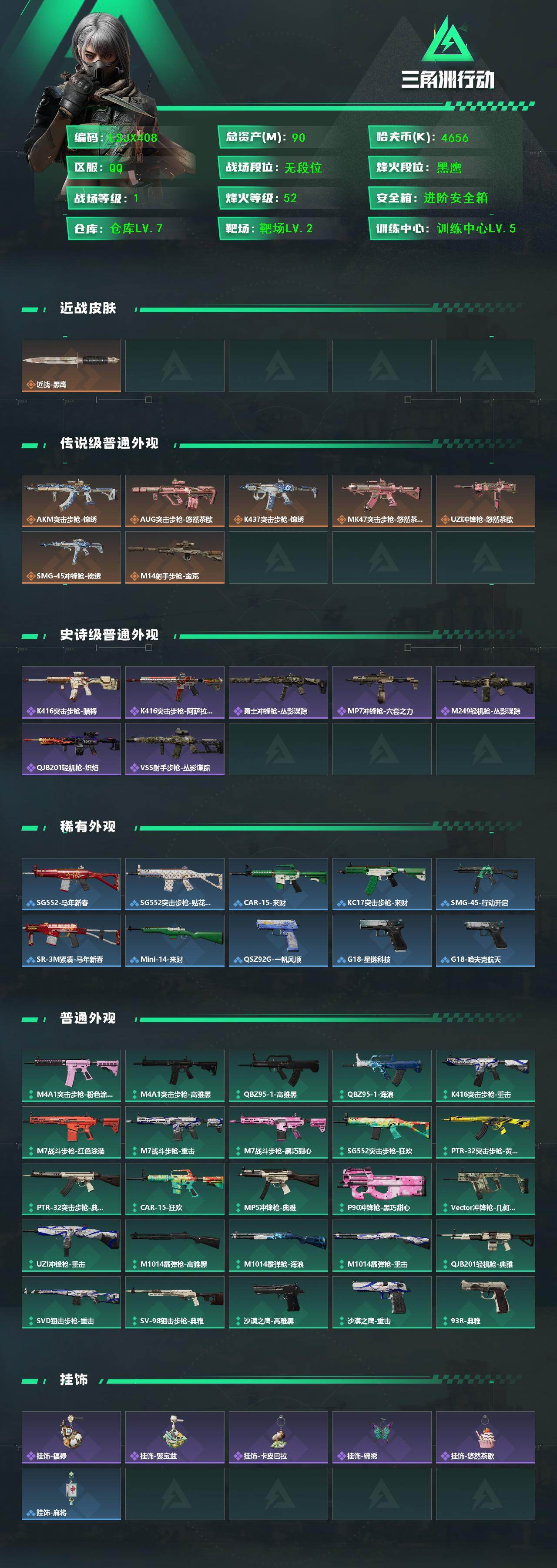 [17574708]【特价出售/店主推荐】90m总资产-4656k哈伏币-52烽火等级-黑鹰-1战场等级-无军衔 【近战皮肤】:近战-黑鹰 【稀有外观】:SG552突击步枪-马年新春,SG552突击步枪-贴花艺术,CAR-15突击步枪-来财,KC17突击步枪-来财,SMG-45冲锋枪-行动开启,SR-3M紧凑突击步枪-马年新春,Mini-14射手步枪-来财,QSZ92G-一帆风顺,G18-星链科技,G18-哈夫克航天 【史诗外观】:K416突击步枪-腊梅,K416突击步枪-阿萨拉特攻,勇士冲锋枪-丛影谍踪,MP7冲锋枪-六套之力,M249轻机枪-丛影谍踪,QJB201轻机枪-炽焰,VSS射手步枪-丛影谍踪 【挂饰】:挂饰-福禄*3,挂饰-聚宝盆*3,挂饰-卡皮巴拉,挂饰-锦绣,挂饰-悠然茶歇,挂饰-麻将*12 【普通外观】:M4A1突击步枪-粉色涂装,M4A1突击步枪-高雅黑,QBZ95-1突击步枪-高雅黑,QBZ95-1突击步枪-海浪,K416突击步枪-重击,M7战斗步枪-红色涂装,M7战斗步枪-重击,M7战斗步枪-黑巧甜心,SG552突击步枪-狂欢,PTR-32突击步枪-黄蜂,PTR-32突击步枪-典雅,CAR-15突击步枪-狂欢,MP5冲锋枪-典雅,P90冲锋枪-黑巧甜心,Vector冲锋枪-几何迷彩,UZI冲锋枪-重击,M1014霰弹枪-高雅黑,M1014霰弹枪-海浪,M1014霰弹枪-重击,QJB201轻机枪-典雅,SVD狙击步枪-重击,SV-98狙击步枪-典雅,沙漠之鹰-高雅黑,沙漠之鹰-重击,93R-典雅 【传说外观】:AKM突击步枪-锦绣,AUG突击步枪-悠然茶歇,K437突击步枪-锦绣,MK47突击步枪-悠然茶歇,UZI冲锋枪-悠然茶歇,SMG-45冲锋枪-锦绣,M14射手步枪-蛮荒