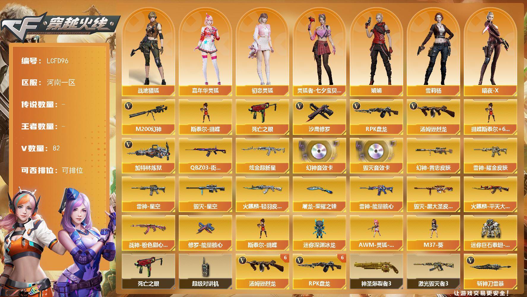 [17575726]幻神三件套,河南一区-83V-0王者武器数-1炫金武器数 【热门武器】:M200-幻神,死亡之眼*5,QBZ03-街机,汤姆逊-烈龙*6,RPK-盘龙*6,加特林-炼狱,斯泰尔-蝴蝶,沙鹰-修罗*5 【王者炫金武器】:炫金超新星 【音效卡】:M200-幻神音效卡,Barrett-毁灭音效卡 【皮肤】:M200-幻神-黄忠皮肤,雷神-能量核心,雷神-星空,雷神-耀金皮肤,火麒麟-轻羽皮肤,火麒麟-平天大圣*2,毁灭-星空,毁灭-黑大圣皮肤,战神-粉色甜心皮肤,修罗-能量核心,屠龙-荣耀之锋 【角色】:零,葵,炫,迷迭香,战地猎狐,暗夜-X,初恋灵狐,风暴女,嘉年华灵狐,娟娟,兰-海滩派对,灵狐者-黄金海岸,灵狐者-七夕宝贝,龙儿,铁骑荣耀,雪莉杨,影武者-X 【人偶武器】:斯泰尔-蝴蝶,AWM-灵狐-15周年嘉年华,M37-葵,迷你深渊冰龙,迷你巨石泰坦-魔花研究所 【暴走生化】:死亡之眼*5,超级对讲机 【挑战大师】:神圣爆裂者III,激光毁灭者III*2 【英雄级武器】:AK47-火麒麟,M4A1-黑龙,M4A1-雷神*3,AK47-无影,M4A1-龙血*3,M4A1-雷霆,AK-47-猩红传说,黑骑士-海王,AWM-天龙,Barrett-毁灭*3,Barrett-极光*2,M200-幻神,RPK-盘龙*6,加特林-炼狱,汤姆逊-烈龙*6,沙鹰-修罗*5,COP-雷霆,屠龙*4,龙啸*5,擎天*2,麒麟刺*2,尼泊尔-雷霆,斩神刀-雷暴,高爆手雷-雷霆*5,高爆手雷-雷暴*3,闪光弹-雷霆*5,闪光弹-雷暴*3,烟雾弹-雷霆*5,烟雾弹-雷暴*3,M4A1-赤狱骑士 【源级武器】:源-千变*2,源·火麒麟,御·火麒麟-平天大圣,源·雷神*2,魂-雷神-萌杀,魂·雷神-15周年嘉年华,御·雷神-机甲刑天,御·雷神-葫芦兄弟,御·雷神-小白龙,御·黑骑士·哪吒闹海,源·武圣,源·HK417-朱雀,魂·QBZ03-金色蔷薇-萌杀,源·天龙,源·毁灭,魂·毁灭-神秘黑洞,御·炼狱-女娲,魂·修罗-15周年嘉年华,源·天神,源·武圣glock,源-擎天,魂·龙啸-NICE*3 【道具】:云海游龙炫彩背包,炫彩背包,超级背包,黑桃战神背包,救世主-黑桃战神,灵魂忍者,变异宝贝,妖姬,生化弹匣,夺命之镰,防化服,流光-再燃火线,枪王排位28赛季金色流光,枪王排位29赛季金色流