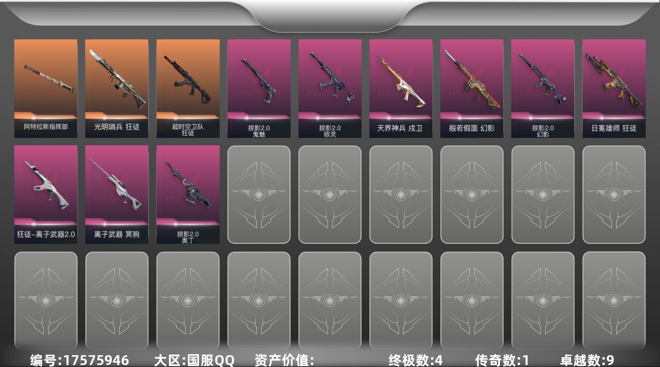 - [15339810]【店主推荐捡漏号!可直接换绑】【套装】:2025全球冠军赛套装,光荣异象套装,RGX 11z Pro套装,VCT 2025 赛季套装,RGX 11z Pro//2.0套装,创·纪元套装,离火刃套装,归零者套装,神中神罚套装,离火刃套装 【英雄】:幻棱,炼狱,维斯,暮蝶,钛狐,壹决,铁臂,捷风,雷兹,幽影,不死鸟,贤者,猎枭,蝰蛇,零,芮娜,奇乐,尚勃勒,霓虹,斯凯,夜露,星礈,K/O,海神,盖可,黑梦,钢锁 【近战 武器】:近战武器-2025全球冠军赛 蝴蝶刀,近战武器-影钩,近战武器-光荣异象 歧途,近战武器-RGX 11z Pro 战刀,近战武器-神之刃,近战武器-RGX 11z Pro//2.0 蝴蝶刀,近战武器-侦察力量 蝴蝶刀,近战武器-剥皮小刀,近战武器-VCT 2025 爪刀,近战武器-紫金爪刀,近战武器-RGX 11z Pro//3.0 爪刀,近战武器-离火刃,近战武器-落英飞旋,近战武器-镭切,近战武器-鬼丸国纲,近战武器-流星兵团 短剑,近战武器-超能偶像 应援棒,近战武器-生物收割器,近战武器-神圣领域 战刀,近战武器-阿特拉斯指挥部 甩棍,近战武器-星际猎兵 短剑 【狂徒】:狂徒-艾沃莉的梦之翼,狂徒-2025全球冠军赛,狂徒-2023全球冠军赛,狂徒-归零者,狂徒-混沌序曲,狂徒-塑水宗,狂徒-创·纪元,狂徒-RGX 11z Pro,狂徒-光荣异象,狂徒-堕天遗武,狂徒-掠影,狂徒-盖亚的复仇,狂徒-海洋之星,狂徒-紫阙金琅,狂徒-超能偶像,狂徒-钢轨卫士,狂徒-弧光异彩,狂徒-流星兵团,狂徒-沙尘幻旅,狂徒-诡秘蛇影 【幻影】:幻影-源能者娱乐系统,幻影-洪荒怒焰,幻影-砰砰X特攻队,幻影-RGX 11z Pro//2.0,幻影-末日泡泡,幻影-天界神兵//2.0,幻影-神中神罚,幻影-超限闪存,幻影-合金战车,幻影-神圣领域,幻影-聚合之力,幻影-战术小伙伴 【戍卫】:戍卫-破败军械,戍卫-RGX 11z Pro,戍卫-天界神兵,戍卫-超能偶像,戍卫-钢轨卫士,戍卫-彩梦之城,戍卫-浮光跃金,戍卫-花漾粉红,戍卫-萌彩剪影,戍卫-战术熊与伙伴们,戍卫-月球哨兵,戍卫-折光棱晶 【獠犬】:獠犬-归零者,獠犬-弧光异彩,獠犬-神圣领域,獠犬-采蜜小蜂队,獠犬-胡桃狂想,獠犬-模拟赫兹,獠犬-数码咒术,獠犬-战术小伙伴 【冥驹】:冥驹-归零