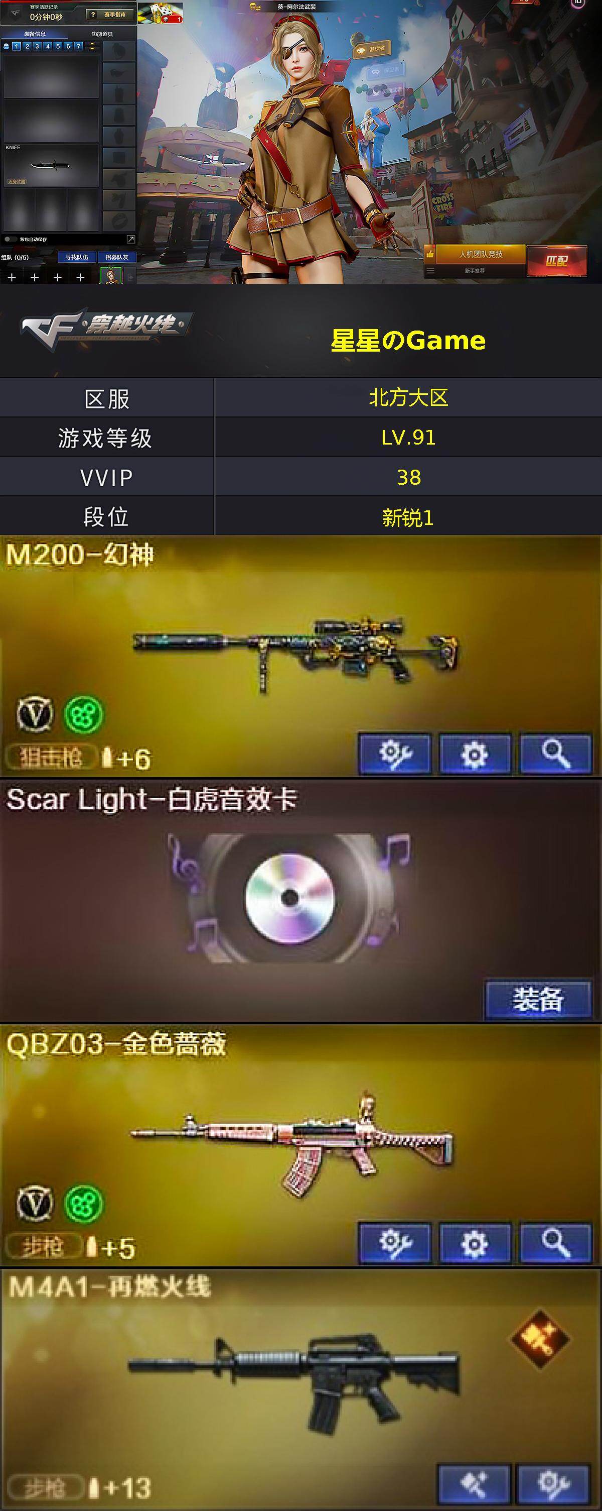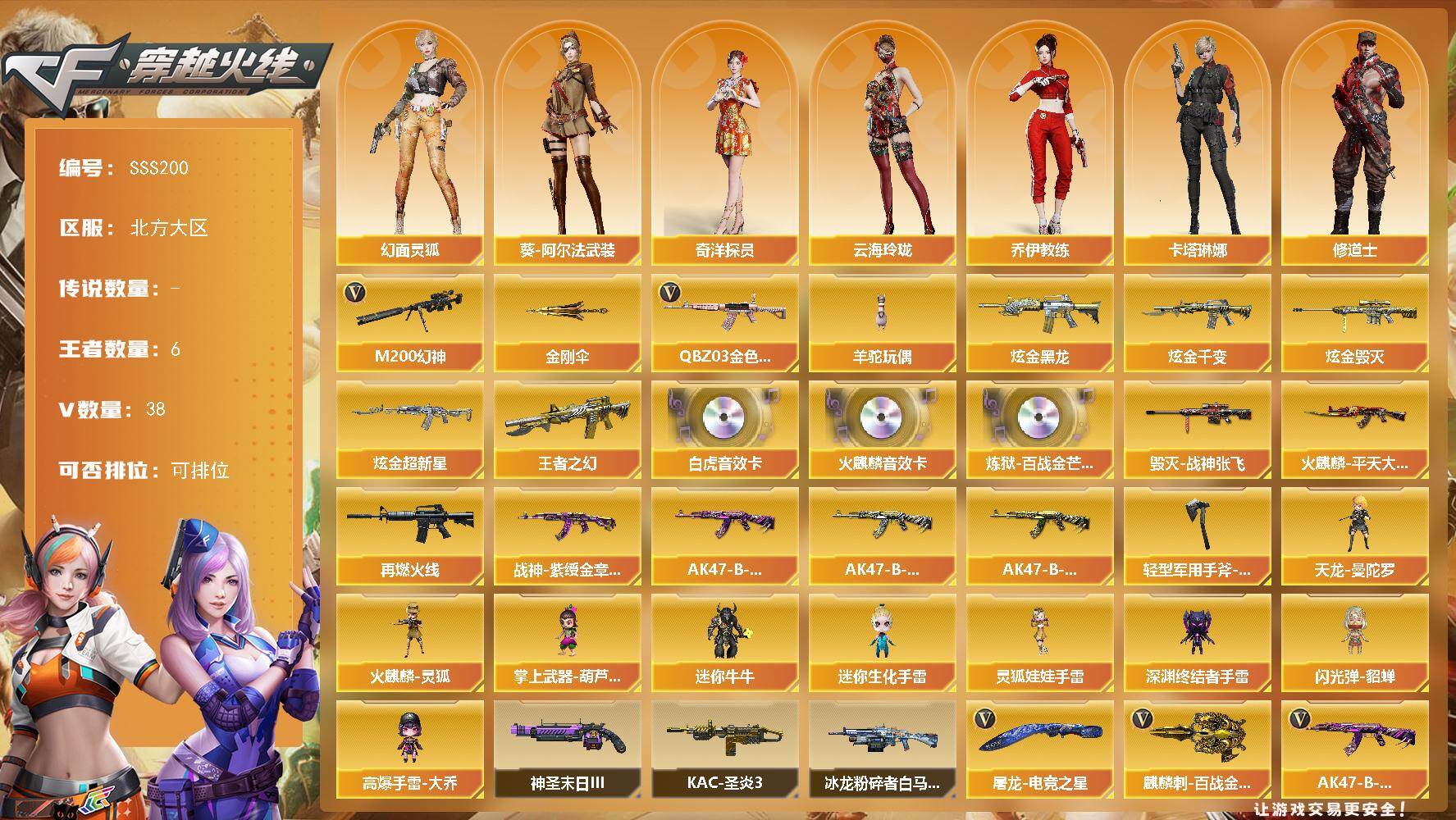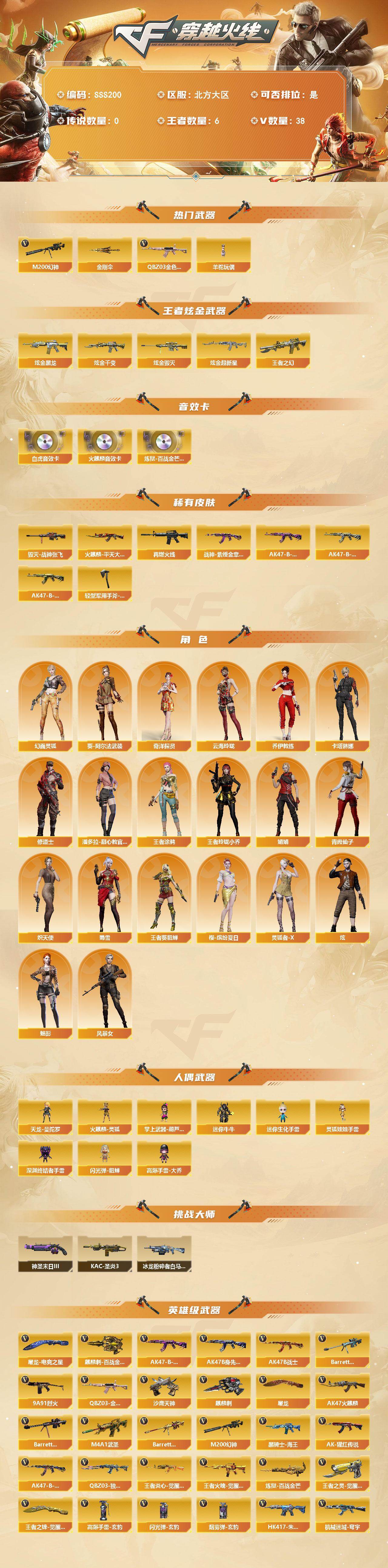 [17576141]北方大区-44V-6王者武器数-5炫金武器数 【热门武器】:QBZ03-金色蔷薇,M200-幻神,羊驼玩偶,金刚伞 【王者炫金武器】:王者之幻,炫金黑龙*2,炫金千变,炫金超新星,炫金毁灭 【音效卡】:AK47-火麒麟音效卡,Scar Light-白虎音效卡,炼狱-百战金芒-庆典舞曲音效卡 【皮肤】:M4A1-再燃火线,火麒麟-平天大圣,毁灭-战神张飞,战神-紫绶金章皮肤,AK47-B-常胜将军-曹操*2,AK47-B-常胜将军-刘备*2,AK47-B-常胜将军-孙权,轻型军用手斧-再燃火线 【角色】:魅影,炫,王者-葵-貂蝉,王者涂鸦,王者玲珑-小乔,奇洋探员,乔伊教练,修道士,云海玲珑,葵-阿尔法武装,幻面灵狐,炽天使,风暴女,娟娟,卡塔琳娜,灵狐者-X,潘多拉-甜心教官,青霞仙子,蜀雪,樱-缤纷夏日 【人偶武器】:天龙-曼陀罗,火麒麟-灵狐,迷你牛牛,迷你生化手雷,深渊终结者手雷,闪光弹-貂蝉,高爆手雷-大乔,灵狐娃娃手雷,掌上武器-葫芦兄弟 【挑战大师】:冰龙粉碎者-白马银枪,KAC-圣炎切割者III,神圣爆裂者-末日III 【英雄级武器】:AK47-火麒麟,M4A1-武圣,QBZ03-独角-V,QBZ03-金色蔷薇,9A91-烈火*2,AK-47-猩红传说,AK47-B-战神,王者炎心-觉醒版,王者火魄-觉醒版,黑骑士-海王*2,AK47-B-常胜将军,HK417-朱雀-电竞之星,机械迷城-穹宇,AK47-B-身先士卒,AK47-B-战士,Barrett-毁灭,M200-幻神,Barrett-朱雀,Barrett-暗月传说,炼狱-百战金芒,沙鹰-天神*3,王者之灵-觉醒版,屠龙*2,麒麟刺,麒麟刺-百战金芒,王者之锋-觉醒版,屠龙-电竞之星,高爆手雷-玄豹,闪光弹-玄豹,烟雾弹-玄豹 【源级武器】:源·火麒麟,源·雷神*2,魂·雷神-神秘按键,御·雷神-葫芦兄弟,御·雷神-小白龙,源·无影,源·天启,源·超新星,源·机械迷城,M4A1-青龙-掌上穿越火线,源-金色蔷薇,金色蔷薇-狼王,魂·QBZ03-金色蔷薇-萌杀,源·玫瑰精灵,魂·英雄-湾区光枢,源·天龙,魂·裁决-凤灵,魂·毁灭-神秘黑洞*2,御·毁灭-黑大圣,御·毁灭-葫芦兄弟,魂·Barrett-朱雀-锦鲤,灵·Barrett-朱雀-炫光,源·炼狱,魂·炼狱-月*2,御·炼狱-女娲,源·天神,灵