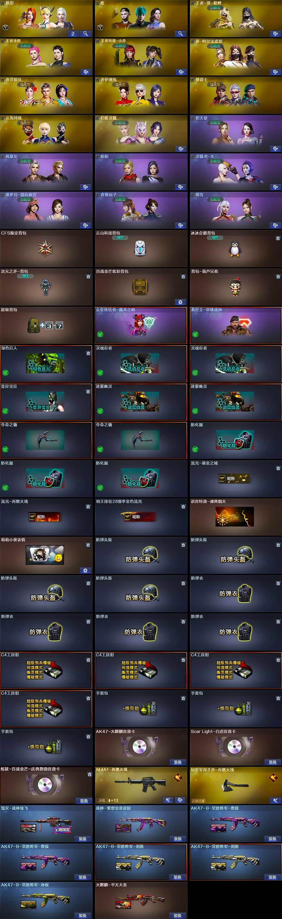 - [16459516]江苏一区-27V-6王者武器数-0炫金武器数 【热门武器】:QBZ03-金色蔷薇,M200-竞技荣光,炽芒蝶刃 【王者炫金武器】:王者之心,王者之锋,王者之魄高爆手雷 【音效卡】:Barrett-碧霄极光音效卡*3,AWM-昌龙-怀旧音效卡 【皮肤】:金色蔷薇-Heartshot皮肤,雷神-能量核心,火麒麟-心动糖果,毁灭-暗月 【角色】:电竞教官-云悠悠,雨墨,战地猎狐,乔伊教练,修道士,北极狐-X,初恋灵狐,嘉年华灵狐,麻雀,女战神,潘多拉-X,斯沃特-X,雪莉杨-摸金校尉,影武者-X 【人偶武器】:王者沙鹰-神勇金戈,AWM-灵狐-15周年嘉年华,生化手雷-机甲核心,迷你超能女侍,QBZ03-斯沃特,灵狐娃娃手雷 【暴走生化】:超级对讲机 【挑战大师】:冰龙粉碎者-白马银枪,激光毁灭者III-白马银枪 【英雄级武器】:AK47-火麒麟,M4A1-黑龙,M4A1-雷神,无影-神兵利器,QBZ03-金色蔷薇,王者之魄-觉醒版,Barrett-毁灭,M200-竞技荣光,王者幻神-觉醒版,沙鹰-天神,柯尔特-竞技荣光,炽芒蝶刃,高爆手雷-竞技荣光,闪光弹-竞技荣光,烟雾弹-竞技荣光,M4A1-赤狱骑士,M4A1-苍鸣雷神,Barrett-碧霄极光 【道具】:CFS限定背包,全能枪王背包,奇洋探员-海龟背包,女皇终结者-背包,背包-洛丽塔,超级背包,女皇终结者-魔龙之吻,救世主-黑桃战神,黄金生化钩,绿色巨人,灵魂忍者,迷雾幽灵,夺命之镰,防化服*3,金色流光-枪王排位,流光-鎏金之域,流光-再燃火线,枪王排位29赛季金色流光,语音特效-机器人,语音特效-生化,防弹头盔*4,防弹衣*4,C4工具钳*4,手雷包*4 【特殊枪械】:
