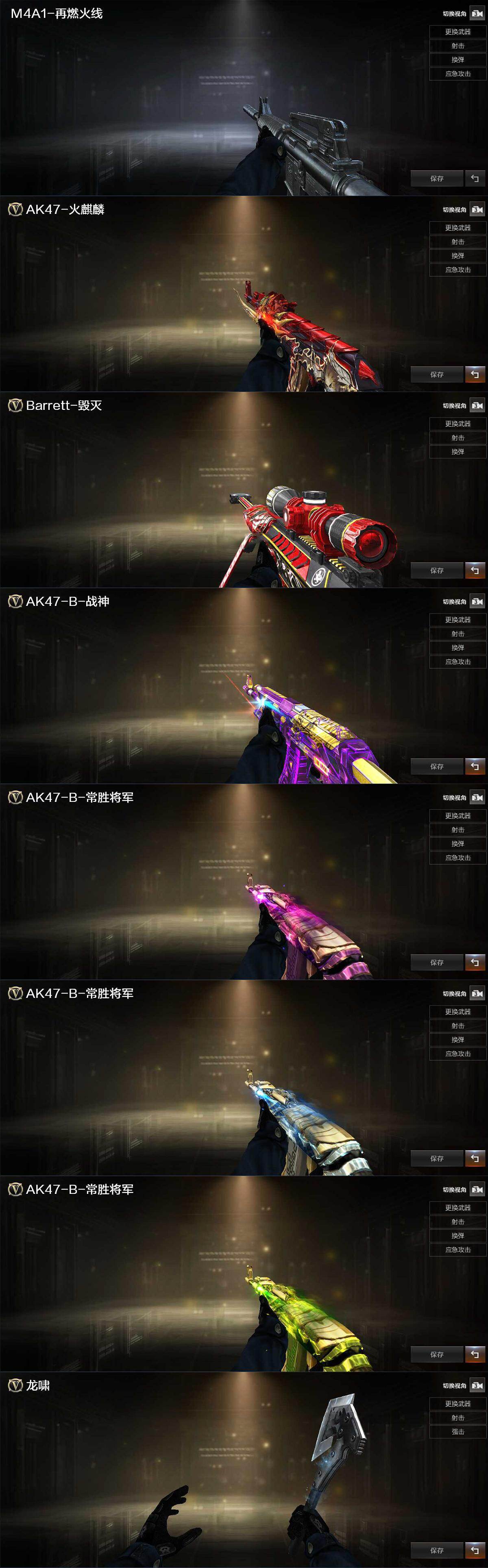 【皮肤】:M4A1-再燃火线,火麒麟-平天大圣,毁灭-战神张飞,战神-紫绶金章皮肤,AK47-B-常胜将军-曹操*2,AK47-B-常胜将军-刘备*2,AK47-B-常胜将军-孙权,轻型军用手斧-再燃火线