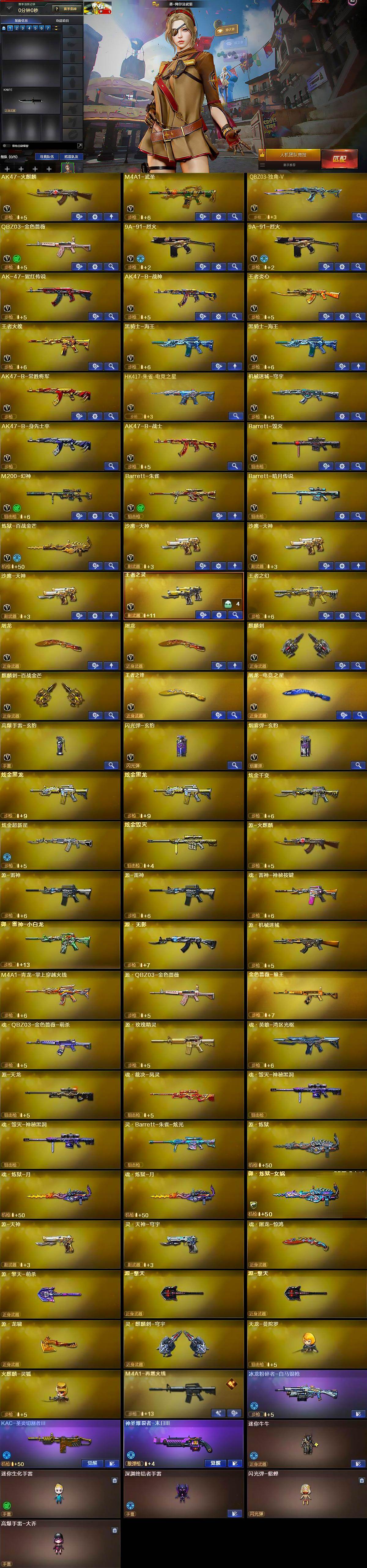 【源级武器】:源·火麒麟,源·雷神*2,魂·雷神-神秘按键,御·雷神-葫芦兄弟,御·雷神-小白龙,源·无影,源·天启,源·超新星,源·机械迷城,M4A1-青龙-掌上穿越火线,源-金色蔷薇,金色蔷薇-狼王,魂·QBZ03-金色蔷薇-萌杀,源·玫瑰精灵,魂·英雄-湾区光枢,源·天龙,魂·裁决-凤灵,魂·毁灭-神秘黑洞*2,御·毁灭-黑大圣,御·毁灭-葫芦兄弟,魂·Barrett-朱雀-锦鲤,灵·Barrett-朱雀-炫光,源·炼狱,魂·炼狱-月*2,御·炼狱-女娲,源·天神,灵