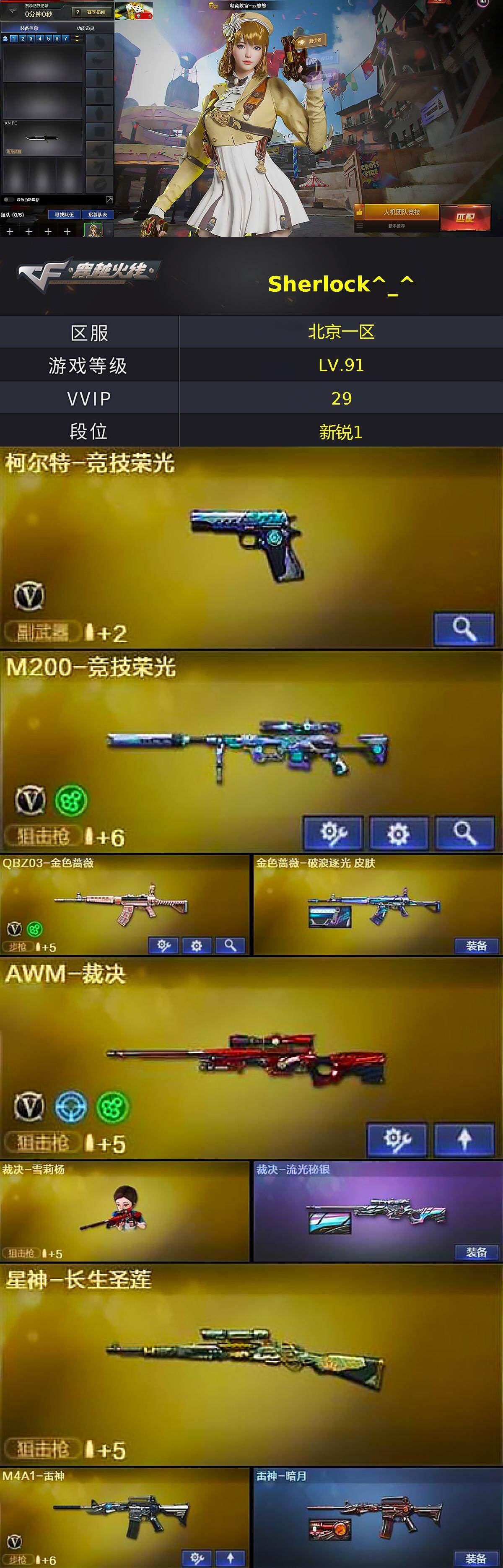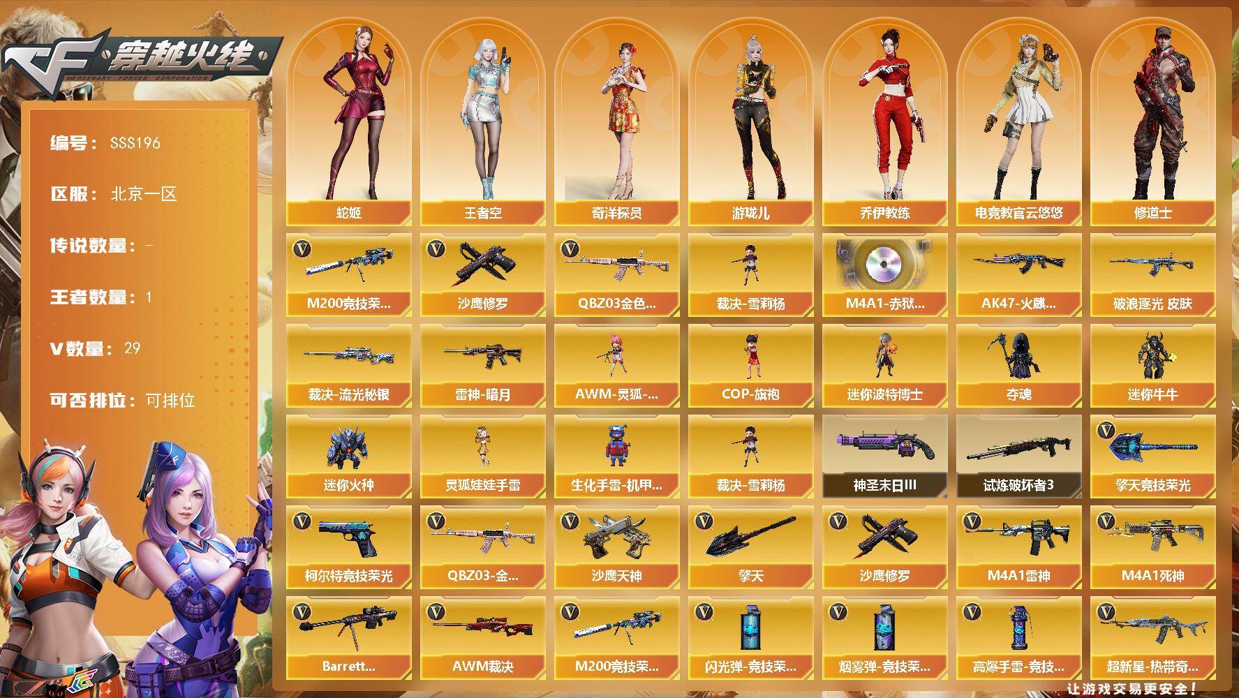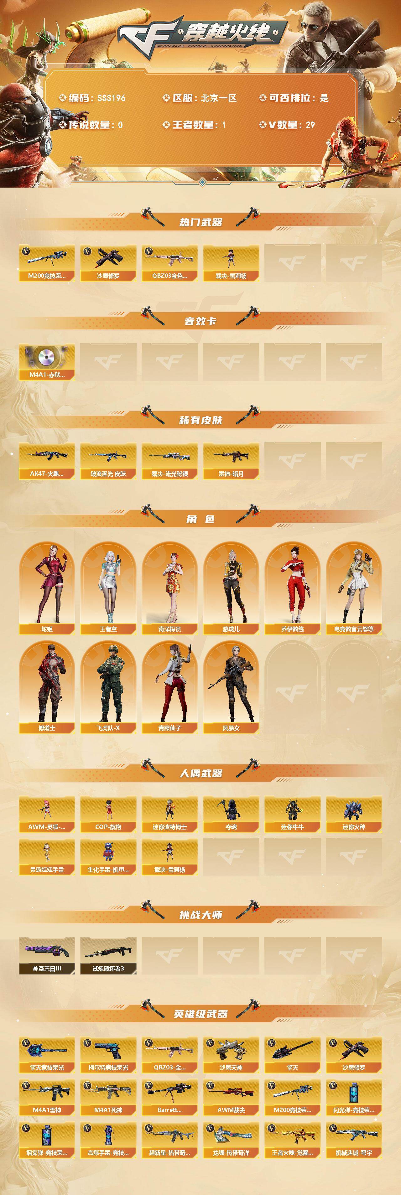 [17576754]北京一区-28V-1王者武器数-0炫金武器数 【热门武器】:QBZ03-金色蔷薇,M200-竞技荣光,裁决-雪莉杨,沙鹰-修罗 【音效卡】:M4A1-赤狱骑士-怀旧音效卡 【皮肤】:金色蔷薇-破浪逐光 皮肤,裁决-流光秘银,雷神-暗月,AK47-火麒麟-传奇EVEN 【角色】:电竞教官-云悠悠,王者空,奇洋探员,乔伊教练,修道士,飞虎队-X,风暴女,青霞仙子,蛇姬,游珑儿 【人偶武器】:裁决-雪莉杨,AWM-灵狐-15周年嘉年华,COP-旗袍,迷你波特博士,夺魂,迷你牛牛*2,迷你火种,生化手雷-机甲核心*2,灵狐娃娃手雷 【挑战大师】:试炼破坏者III,神圣爆裂者-末日III 【英雄级武器】:M4A1-雷神,M4A1-死神,超新星-热带奇洋,QBZ03-金色蔷薇,王者火魄-觉醒版,机械迷城-穹宇,Barrett-毁灭,AWM-裁决,M200-竞技荣光,沙鹰-修罗,沙鹰-天神,柯尔特-竞技荣光,擎天,擎天-竞技荣光,龙啸-热带奇洋,高爆手雷-竞技荣光*6,闪光弹-竞技荣光*4,烟雾弹-竞技荣光*4 【源级武器】:魂·雷神-新春神龙,魂·黑骑士-破浪10年,魂·QBZ03-金色蔷薇-蛇姬,QBZ03-文殊坊*2,魂·英雄-湾区光枢,魂·裁决-凤灵,魂·裁决-羽掣,星神-长生圣莲,魂·毁灭-秦师,魂·毁灭-神秘黑洞,魂·天神-阿努比斯,灵·天神-穹宇,魂·屠龙-惊鸿,灵·麒麟刺-穹宇 【道具】:BS战队炫彩背包,CFS限定背包,亚洲杯纪念炫彩背包,奇洋探员-海龟背包,热带奇洋炫彩背包,臻选金狐背包,超级背包,救世主-黑桃战神,绿色巨人,灵魂忍者*2,变异宝贝,迷雾幽灵*2,生化弹匣,夺命之镰,防化服*3,星辰流光-枪王排位,流光-鎏金之域,枪王排位28赛季金色流光,枪王排位29赛季金色流光,热带奇洋表情,EP战队名片,EP战队喷图,防弹头盔*3,防弹衣*3,C4工具钳*3,手雷包*3 【特殊枪械】: