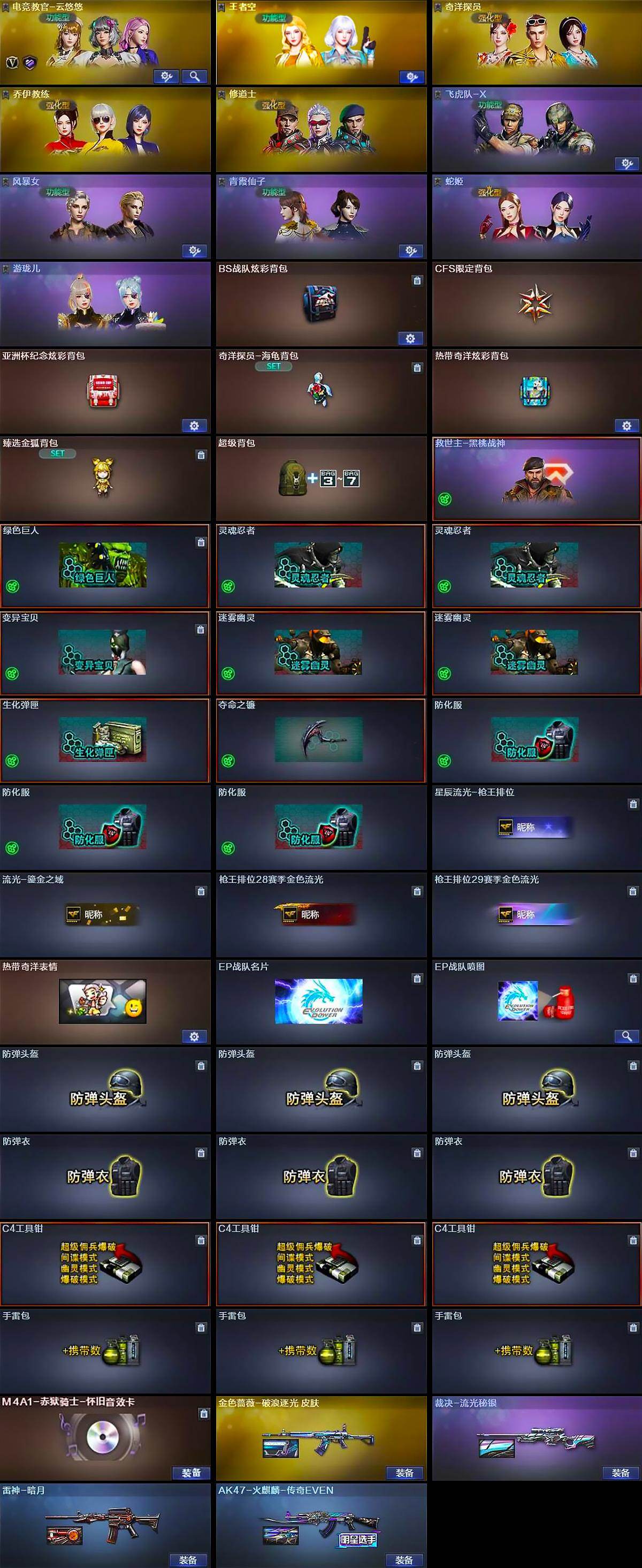 【道具】:BS战队炫彩背包,CFS限定背包,亚洲杯纪念炫彩背包,奇洋探员-海龟背包,热带奇洋炫彩背包,臻选金狐背包,超级背包,救世主-黑桃战神,绿色巨人,灵魂忍者*2,变异宝贝,迷雾幽灵*2,生化弹匣,夺命之镰,防化服*3,星辰流光-枪王排位,流光-鎏金之域,枪王排位28赛季金色流光,枪王排位29赛季金色流光,热带奇洋表情,EP战队名片,EP战队喷图,防弹头盔*3,防弹衣*3,C4工具钳*3,手雷包*3