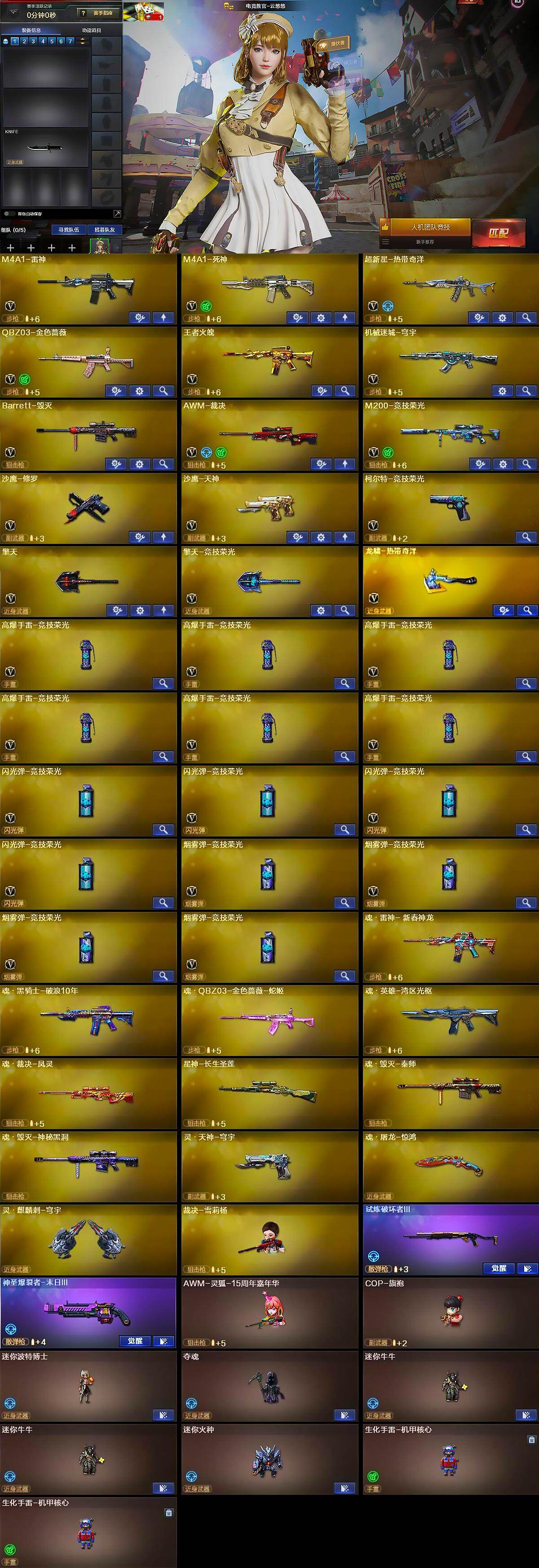 【英雄级武器】:M4A1-雷神,M4A1-死神,超新星-热带奇洋,QBZ03-金色蔷薇,王者火魄-觉醒版,机械迷城-穹宇,Barrett-毁灭,AWM-裁决,M200-竞技荣光,沙鹰-修罗,沙鹰-天神,柯尔特-竞技荣光,擎天,擎天-竞技荣光,龙啸-热带奇洋,高爆手雷-竞技荣光*6,闪光弹-竞技荣光*4,烟雾弹-竞技荣光*4