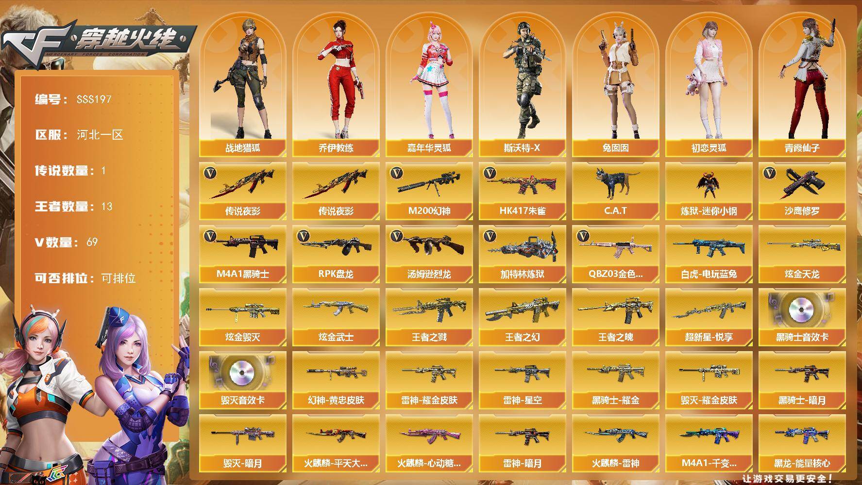- [16481198]上海一区-42V-2王者武器数-0炫金武器数 【热门武器】:QBZ03-金色蔷薇,Scar Light-白虎,M200-竞技荣光,柯尔特-冠军之特,M4A1-黑骑士,沙鹰-修罗*4 【王者炫金武器】:超新星-悦享,烈龙-悦心 【音效卡】:M4A1-雷神音效卡,绝迹语音包,死神-雪域霜狐-怀旧音效卡 【皮肤】:Scar Light-白虎-暗星,QBZ03-冠军之薇,雷神-暗月,雷神-冠军之魄,火麒麟-百城,火麒麟-心动糖果,毁灭-暗月*2,毁灭-英雄计划 皮肤,无影-暗月,无影-能量核心*2,天启-暗月,AK47-B-常胜将军-孙权*2,极光-能量核心 【角色】:葵,电竞教官-云悠悠,战地猎狐,雪域霜狐,初恋灵狐,灵狐者-X,灵狐者-七夕宝贝,潘多拉-甜心教官,斯沃特-X,铁骑荣耀,影武者-X,职业选手 【人偶武器】:迷你超能女侍 【暴走生化】:超级对讲机 【挑战大师】:冰龙粉碎者-白马银枪,神圣爆裂者-末日III 【英雄级武器】:AK47-火麒麟*2,M4A1-雷神*2,M4A1-黑骑士,AK47-无影,AK12-天启,Scar Light-白虎,死神-雪域霜狐,QBZ03-金色蔷薇,AK-47-猩红传说,AK47-B-常胜将军*2,AWM-天龙,Barrett-毁灭*2,Barrett-极光,M200-竞技荣光,沙鹰-修罗*4,沙鹰-天神,柯尔特-冠军之特,柯尔特-竞技荣光,屠龙,擎天-竞技荣光,高爆手雷-竞技荣光,闪光弹-雷霆,闪光弹-雷暴,闪光弹-竞技荣光,烟雾弹-竞技荣光,M4A1-赤狱骑士 【道具】:EP战队炫彩背包,亚洲杯纪念炫彩背包,战舰背包,炫彩背包,虎牙炫彩背包,雪域霜狐炫彩背包,救世主-黑桃战神,绿色巨人,灵魂忍者,迷雾幽灵,夺命之镰,防化服*2,流光-再燃火线,枪王排位29赛季金色流光,语音特效-怀旧,雪域霜狐表情,电玩兔兔表情,EP战队名片,防弹头盔*2,防弹衣*2,C4工具钳*2,手雷包*2 【特殊枪械】:1白虎,1黑骑士