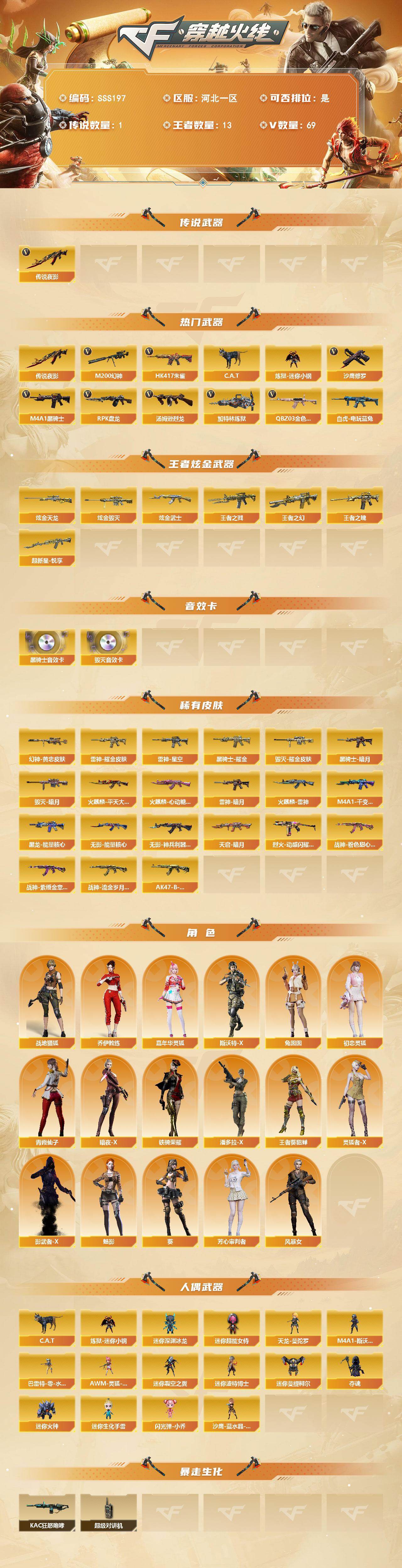 [17576870]河北一区-76V-13王者武器数-3炫金武器数 【传说武器】:传说夜影 【热门武器】:传说夜影,QBZ03-金色蔷薇,HK417-朱雀,M200-幻神,白虎-电玩蓝兔,C.A.T,炼狱-迷你小钢,M4A1-黑骑士,汤姆逊-烈龙*4,RPK-盘龙*2,加特林-炼狱,沙鹰-修罗*6 【王者炫金武器】:王者之戮,超新星-悦享*2,王者之幻,王者之魄,炫金武士,炫金毁灭,炫金天龙 【音效卡】:M4A1-黑骑士音效卡,Barrett-毁灭音效卡 【皮肤】:M200-幻神-黄忠皮肤,雷神-暗月,雷神-星空,雷神-耀金皮肤,火麒麟-雷神,火麒麟-平天大圣,火麒麟-心动糖果,毁灭-暗月,毁灭耀金皮肤,M4A1-千变-孔明皮肤,黑龙-能量核心,黑骑士-暗月,黑骑士耀金皮肤*2,无影-能量核心,无影-神兵利器 皮肤,天启-暗月,烈火-动感闪耀 皮肤,战神-粉色甜心皮肤*2,战神-紫绶金章皮肤*6,战神-流金岁月皮肤*5,AK47-B-常胜将军-孙权 【角色】:葵,魅影,战地猎狐,王者-葵-貂蝉,乔伊教练,暗夜-X,初恋灵狐,芳心审判者,风暴女*2,嘉年华灵狐,灵狐者-X,潘多拉-X,青霞仙子,斯沃特-X,铁骑荣耀,兔囡囡,影武者-X 【人偶武器】:天龙-曼陀罗,炼狱-迷你小钢,巴雷特-零-水下丽影,AWM-灵狐-15周年嘉年华,C.A.T,迷你深渊冰龙*2,迷你裂空之翼*5,迷你波特博士*3,迷你曼提柯尔*2,夺魂,迷你火种,迷你生化手雷,闪光弹-小乔,沙鹰-蓝水晶-曼陀罗,M4A1-斯沃特,迷你超能女侍 【暴走生化】:KAC-狂怒咆哮,超级对讲机 【挑战大师】:神圣爆裂者III,冰龙粉碎者-白马银枪,VEPR-12-金魔,激光毁灭者III,机甲撕裂者III,试炼破坏者III,KAC-圣炎切割者III,神圣爆裂者-末日III,阐释者III*2,封神放逐者III 【英雄级武器】:AK47-火麒麟*2,M4A1-黑龙*2,M4A1-雷神*2,M4A1-黑骑士,AK47-无影,M4A1-死神,AK47-黑武士,M4A1-武圣,AK47-黑鲨,M4A1-龙血,HK417-朱雀,无影-神兵利器,黑武士-锦绣游龙,M4A1-玫瑰精灵,QBZ03-金色蔷薇,9A91-烈火*2,王者之影-觉醒版,AK-47-猩红传说*2,AK47-B-战神,黑骑士-海王,白虎-电玩蓝兔,AK47-B-战士,Barr