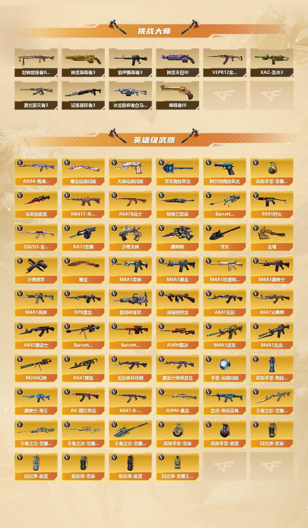 【英雄级武器】:AK47-火麒麟*2,M4A1-黑龙*2,M4A1-雷神*2,M4A1-黑骑士,AK47-无影,M4A1-死神,AK47-黑武士,M4A1-武圣,AK47-黑鲨,M4A1-龙血,HK417-朱雀,无影-神兵利器,黑武士-锦绣游龙,M4A1-玫瑰精灵,QBZ03-金色蔷薇,9A91-烈火*2,王者之影-觉醒版,AK-47-猩红传说*2,AK47-B-战神,黑骑士-海王,白虎-电玩蓝兔,AK47-B-战士,Barr