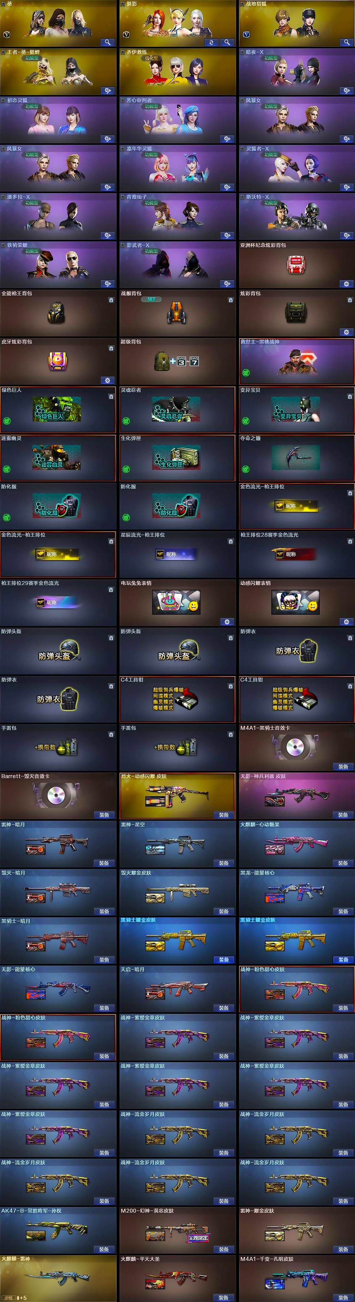 【皮肤】:M200-幻神-黄忠皮肤,雷神-暗月,雷神-星空,雷神-耀金皮肤,火麒麟-雷神,火麒麟-平天大圣,火麒麟-心动糖果,毁灭-暗月,毁灭耀金皮肤,M4A1-千变-孔明皮肤,黑龙-能量核心,黑骑士-暗月,黑骑士耀金皮肤*2,无影-能量核心,无影-神兵利器 皮肤,天启-暗月,烈火-动感闪耀 皮肤,战神-粉色甜心皮肤*2,战神-紫绶金章皮肤*6,战神-流金岁月皮肤*5,AK47-B-常胜将军-孙权