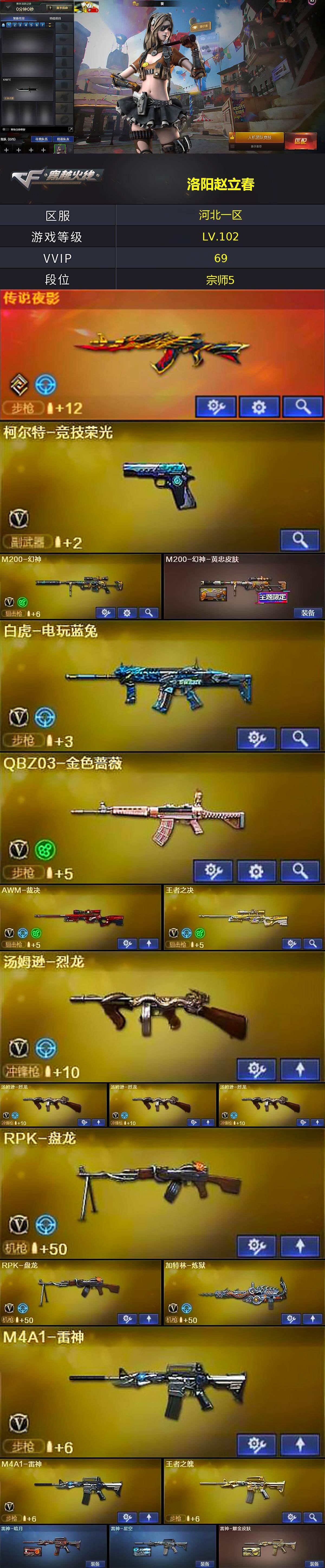 【热门武器】:传说夜影,QBZ03-金色蔷薇,HK417-朱雀,M200-幻神,白虎-电玩蓝兔,C.A.T,炼狱-迷你小钢,M4A1-黑骑士,汤姆逊-烈龙*4,RPK-盘龙*2,加特林-炼狱,沙鹰-修罗*6