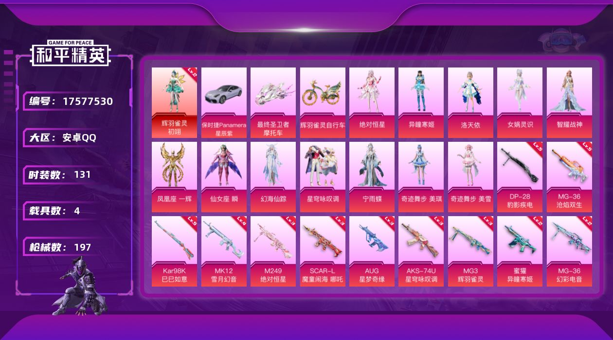 [17577530]安卓 手Q-2神装-17粉装-18特效枪-4载具-17粉色飞行器-78174热力值-5王牌印记-131套装-197枪皮 【红色神装等级】:暮色玫影-艾丽娅(四级),辉羽雀灵-初翊(二级) 【红色角色神装】:暮色玫影-艾丽娅,辉羽雀灵-初翊 【粉色套装】:角色-绝对恒星,角色-洛天依,角色-女娲灵识,角色-智耀战神,角色-凤凰座 一辉,角色-仙女座 瞬,角色-幻海仙踪,粉装-星穹咏叹调,角色-宁雨蝶,角色-奇迹舞步 美琪,角色-奇迹舞步 美雪,角色-异瞳寒姬,角色-罪夜之冕,人物-小舞,人物-小舞·灵珑,人物-小舞·雪昙,人物-小舞·恋语 【粉色枪皮等级】:AKM-幻海仙踪(一级),AKM-暮色玫影(三级),SCAR-L-魔童闹海 哪吒(三级),AUG-星梦奇缘(三级),蜜獾-异瞳寒姬(二级),AKS-74U-星穹咏叹调(三级),AKS-74U-森灵之息(五级),Kar98K-巳巳如意(五级),MK12-雪月幻音(四级),M249-绝对恒星(三级),DP-28-豹影疾电(五级),MG3-辉羽雀灵(三级),MG-36-幻彩电音(二级),MG-36-沧焰双生(五级) 【粉色载具】:保时捷Panamera(星辰紫),最终圣卫者摩托车,暮色幽蹄,辉羽雀灵自行车 【粉色枪皮】:AKM-幻海仙踪,AKM-暮色玫影,SCAR-L-魔童闹海 哪吒,AUG-星梦奇缘,蜜獾-异瞳寒姬,UMP45-萌骑冒险,AKS-74U-星穹咏叹调,AKS-74U-森灵之息,Kar98K-巳巳如意,Mk14-福马献瑞,MK12-雪月幻音,M249-绝对恒星,DP-28-豹影疾电,MG3-辉羽雀灵,MG-36-幻彩电音,MG-36-沧焰双生,信号枪-金乌曜日,燃烧瓶-天降桃花 【粉色飞行器】:绝对恒星飞行器,香车宝马飞行器,炫彩糖果飞行器,沙丘之主天马,圣域金龙飞行器,幻海仙踪飞行器,雀灵庇佑飞行器,终晖之翼飞行器,宁雨蝶飞行器,飞天猪飞行器,灵珠游龙飞行器,极意拳锋飞行器,暮色之舞飞行器,天空之门飞行器,小舞飞行器 【粉色降落伞】:绝对恒星降落伞,四圣焕新降落伞,洛神天依降落伞,未来歌姬降落伞,鸢尾晶梦降落伞,晶梦幻蝶降落伞,樱桃泡泡降落伞,雪月幻音降落伞,圣域龙灵降落伞,智耀战神降落伞,圣斗士星矢降落伞,幻海仙踪降落伞,星穹咏叹调降落伞,辉羽雀灵降落伞,湮灭星辰降落伞,幻彩电音降落伞,时光之誓降落伞