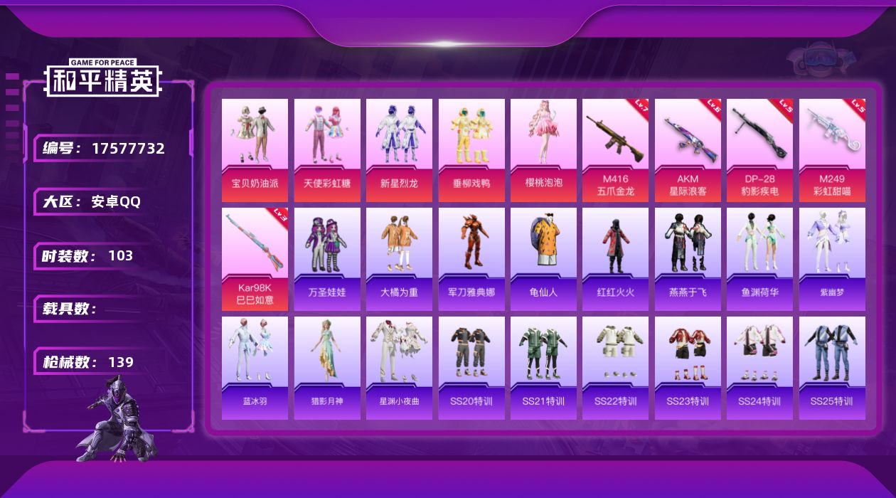 [17577732]安卓 手Q-5粉装-7特效枪-0载具-0粉色飞行器-41860热力值-8王牌印记-103套装-139枪皮 【热门品类】:角色-军刀雅典娜,套装-龟仙人,套装-红红火火 【粉色套装】:粉装-宝贝奶油派,粉装-天使彩虹糖,粉装-新星烈龙,粉装-垂柳戏鸭,角色-樱桃泡泡 【粉色枪皮等级】:AKM-星际浪客(六级),M416-五爪金龙(七级),AKS-74U-森灵之息(三级),Kar98K-巳巳如意(三级),M249-彩虹甜喵(五级),DP-28-豹影疾电(五级) 【粉色枪皮】:AKM-星际浪客,M416-五爪金龙,AKS-74U-森灵之息,Kar98K-巳巳如意,Mk14-福马献瑞,M249-彩虹甜喵,DP-28-豹影疾电 【粉色降落伞】:幻影战神降落伞,百万伏特降落伞,甜心宝贝降落伞,神秘黑猫降落伞,垂柳戏鸭降落伞,太空嘟嘟降落伞,暗夜鎏金降落伞,第五大道降落伞,炫彩糖果降落伞 【稀有套装】:套装-龟仙人,套装-马上来财,套装-燕燕于飞,套装-鱼渊荷华,套装-紫幽梦,套装-蓝冰羽,角色-猎影月神,套装-星渊小夜曲,套装-雨过天青,套装-红釉青花 【稀有枪皮】:AKM-2P战斗服款,AKM-环太平洋,AKM-百万伏特,AKM-缤纷海域,AKM-龙的传人,M16A4-幻世战舞者,M16A4-甜心亚梦,SCAR-L-炫彩节奏,SCAR-L-玉兔迎春,SCAR-L-红色方程式,M416-月影鸳鸯,M416-糯团青竹,M416-红色方程式,GROZA-田园牧歌,AUG-天降萌叽,AUG-幻影战神,AUG-甜蜜菠萝,AUG-耀粉歌者,QBZ-彩虹符号,M762-天降萌叽,M762-萌物绒绒,Mk47-妙红点点,AC-VAL-天降萌叽,AC-VAL-甜心亚梦,蜜獾-垂柳戏鸭,蜜獾-天降萌叽,蜜獾-娇憨猪猪,UZI-啾咪啾咪,UZI-天降萌叽,UZI-娇憨猪猪,UZI-幻影战神,UMP45-生命誓言,Vector-田园牧歌,汤姆逊-天降萌叽,P90-倾城蜜语,Kar98K-彩虹符号,M24-冰封烈焰,AWM-垂柳戏鸭,SKS-炫彩节奏,VSS-星之彼岸,VSS-田园牧歌,Mini14-耀粉歌者,SLR-娇憨猪猪,AMR-妙红点点,M417-惊鸿侠骨,M200-惊鸿侠骨,S1897-炫彩节奏,S12K-垂柳戏鸭,S12K-娇憨猪猪,S12K-幻世战舞者,DBS-彩虹符号,DBS-甜心亚