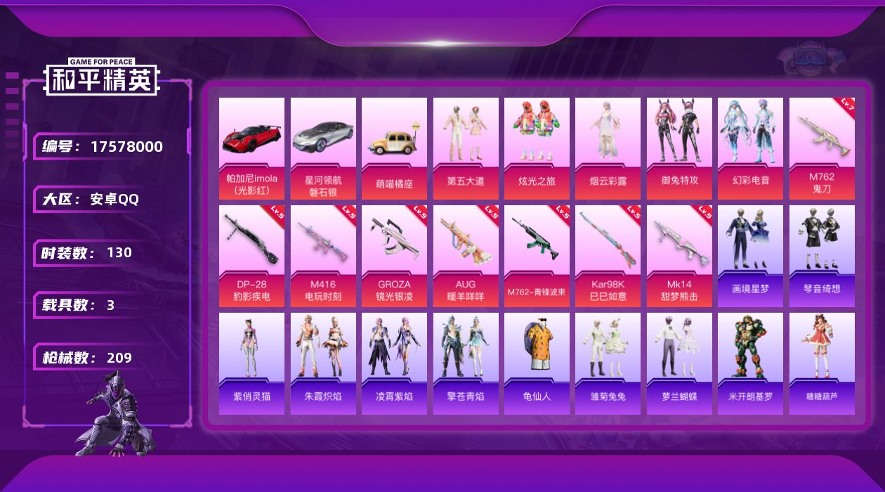 [17578000]安卓 手Q-5粉装-8特效枪-3载具-2粉色飞行器-62242热力值-11王牌印记-130套装-209枪皮