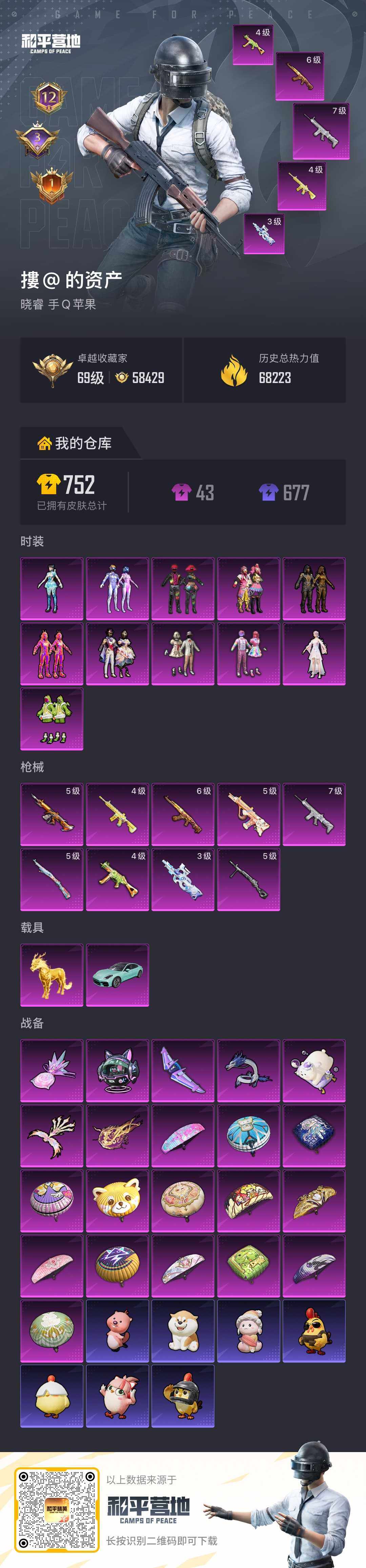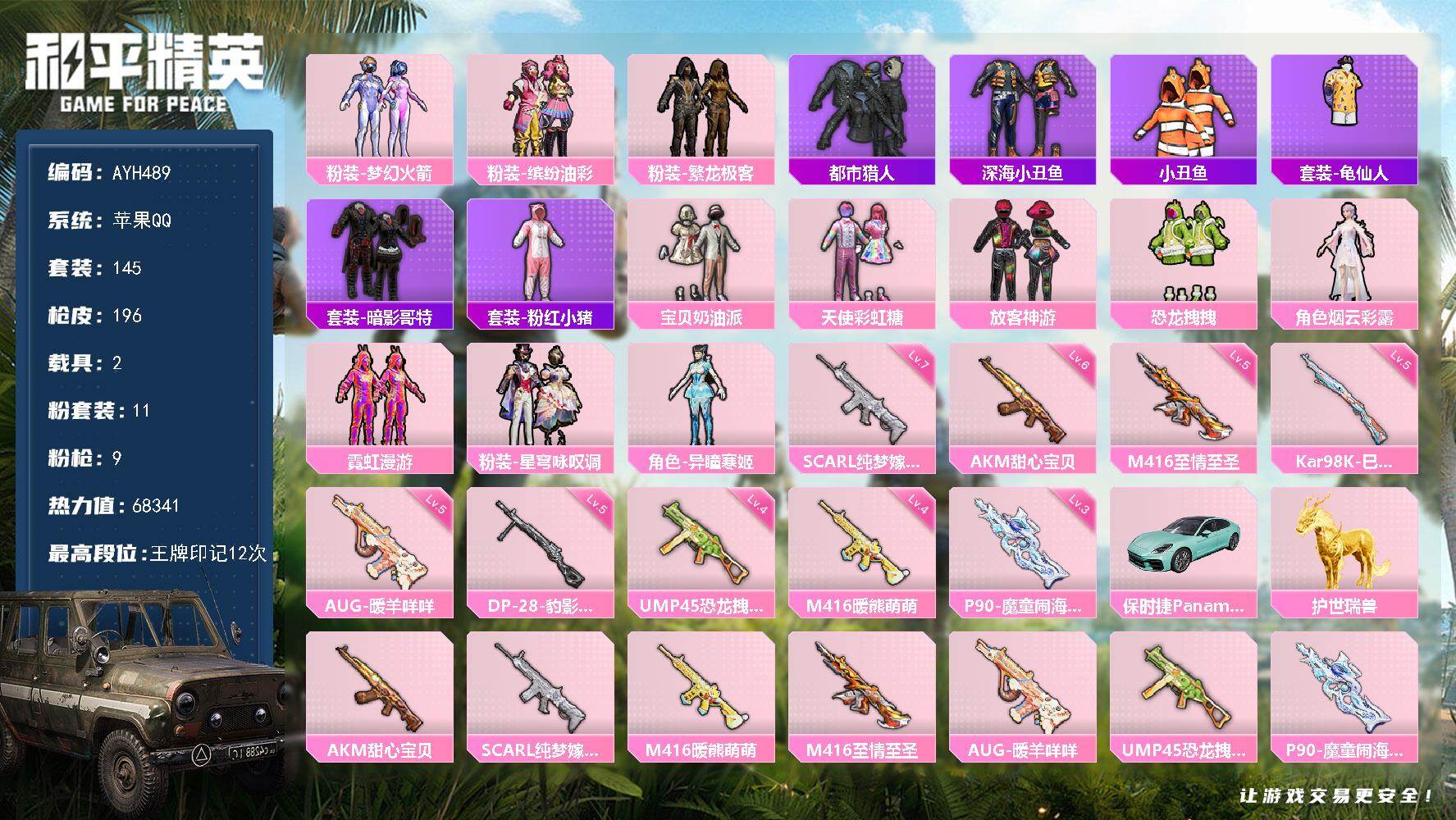 [17578154]苹果 手Q-11粉装-9特效枪-2载具-7粉色飞行器-68341热力值-12王牌印记-145套装-196枪皮