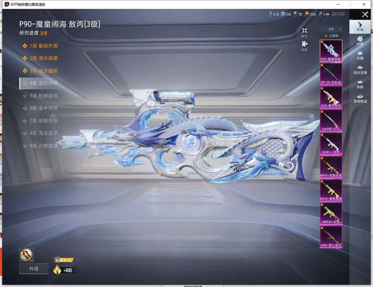 【粉色枪皮等级】:AKM-甜心宝贝(六级),SCAR-L-纯梦嫁纱(七级),M416-暖熊萌萌(四级),M416-至情至圣(五级),AUG-暖羊咩咩(五级),UMP45-恐龙拽拽(四级),P90-魔童闹海 敖丙(三级),Kar98K-巳巳如意(五级),DP-28-豹影疾电(五级)