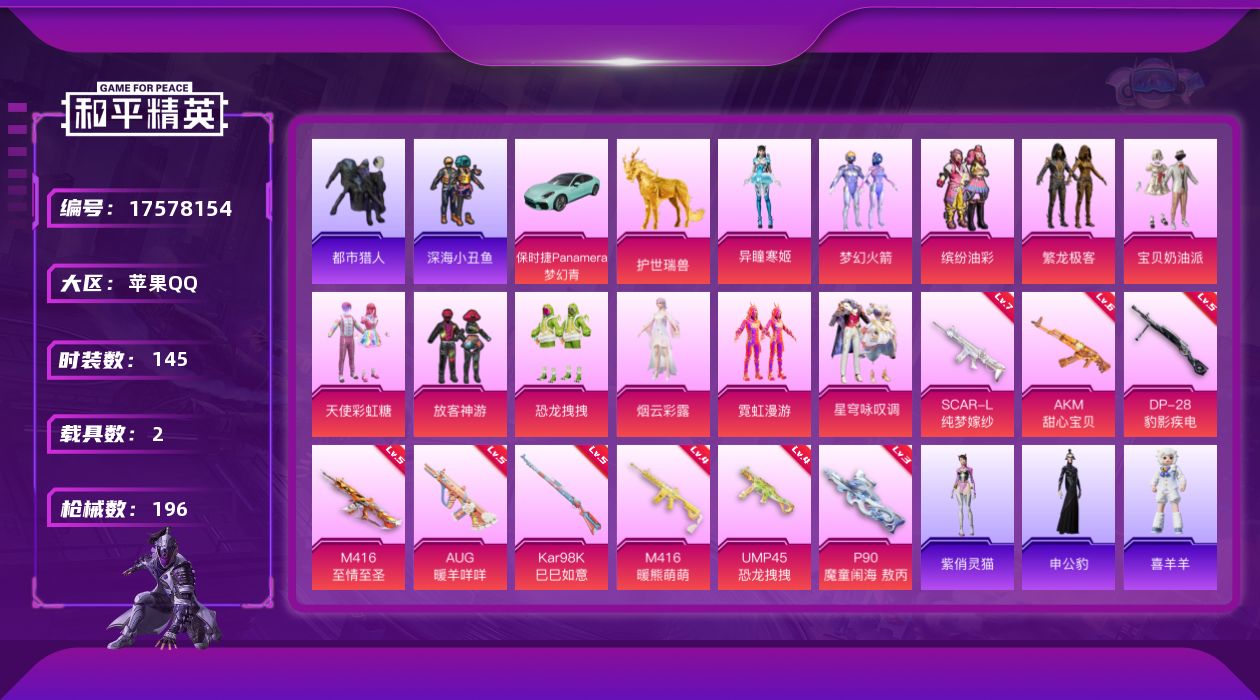 [17578154]苹果 手Q-11粉装-9特效枪-2载具-7粉色飞行器-68341热力值-12王牌印记-145套装-196枪皮 【热门品类】:粉装-梦幻火箭,粉装-缤纷油彩,粉装-繁龙极客,套装-都市猎人,套装-深海小丑鱼,套装-小丑鱼,套装-龟仙人,套装-暗影哥特,套装-粉红小猪 【粉色套装】:粉装-宝贝奶油派,粉装-天使彩虹糖,粉装-梦幻火箭,粉装-缤纷油彩,粉装-放客神游,粉装-恐龙拽拽,粉装-繁龙极客,角色-烟云彩露,粉装-霓虹漫游,粉装-星穹咏叹调,角色-异瞳寒姬 【粉色枪皮等级】:AKM-甜心宝贝(六级),SCAR-L-纯梦嫁纱(七级),M416-暖熊萌萌(四级),M416-至情至圣(五级),AUG-暖羊咩咩(五级),UMP45-恐龙拽拽(四级),P90-魔童闹海 敖丙(三级),Kar98K-巳巳如意(五级),DP-28-豹影疾电(五级) 【粉色载具】:保时捷Panamera(梦幻青),护世瑞兽 【粉色枪皮】:AKM-甜心宝贝,SCAR-L-纯梦嫁纱,M416-暖熊萌萌,M416-至情至圣,AUG-暖羊咩咩,UMP45-恐龙拽拽,P90-魔童闹海 敖丙,Kar98K-巳巳如意,DP-28-豹影疾电 【粉色飞行器】:酣梦熊熊飞行器,炫彩糖果飞行器,梦幻火箭飞行器,凤舞九天飞行器,万象金身飞行器,灵珠游龙飞行器 【粉色降落伞】:幻影战神降落伞,百万伏特降落伞,甜心宝贝降落伞,梦幻火箭降落伞,洛神天依降落伞,恐龙拽拽降落伞,暖熊萌萌降落伞,闲梦青缨降落伞,精灵梦叶罗丽降落伞,临安公主降落伞,金蛇镇世降落伞,星穹咏叹调降落伞,异瞳寒姬降落伞,炫彩糖果降落伞 【稀有套装】:套装-龟仙人,套装-巳巳如意,套装-雏菊兔兔,套装-萝兰蝴蝶,套装-小熊娃娃,套装-糖糖葫芦,套装-青团波波,角色-怀庆长公主,角色-光矢逐梦,套装-燕燕于飞,套装-鱼渊荷华,角色-蜜桃派对,套装-粉恋花,套装-紫幽梦,套装-蓝冰羽,套装-星影赞美诗,套装-星渊小夜曲,套装-霓虹热舞,套装-彩虹兔,套装-云朵鹅,套装-雪绒豹,套装-蓝海鲸歌,套装-朱霞炽焰,套装-凌霄紫焰,套装-擎苍青焰,玩偶服-喜羊羊,角色-申公豹,角色-紫俏灵猫 【稀有枪皮】:AKM-彩虹符号,AKM-影袭,AKM-恐龙拽拽,AKM-灼热熔岩,AKM-破晓战魂,AKM-霓虹街区,AKM-龙的传人,M16A4-幻世战舞者,SCAR-L-炫彩节