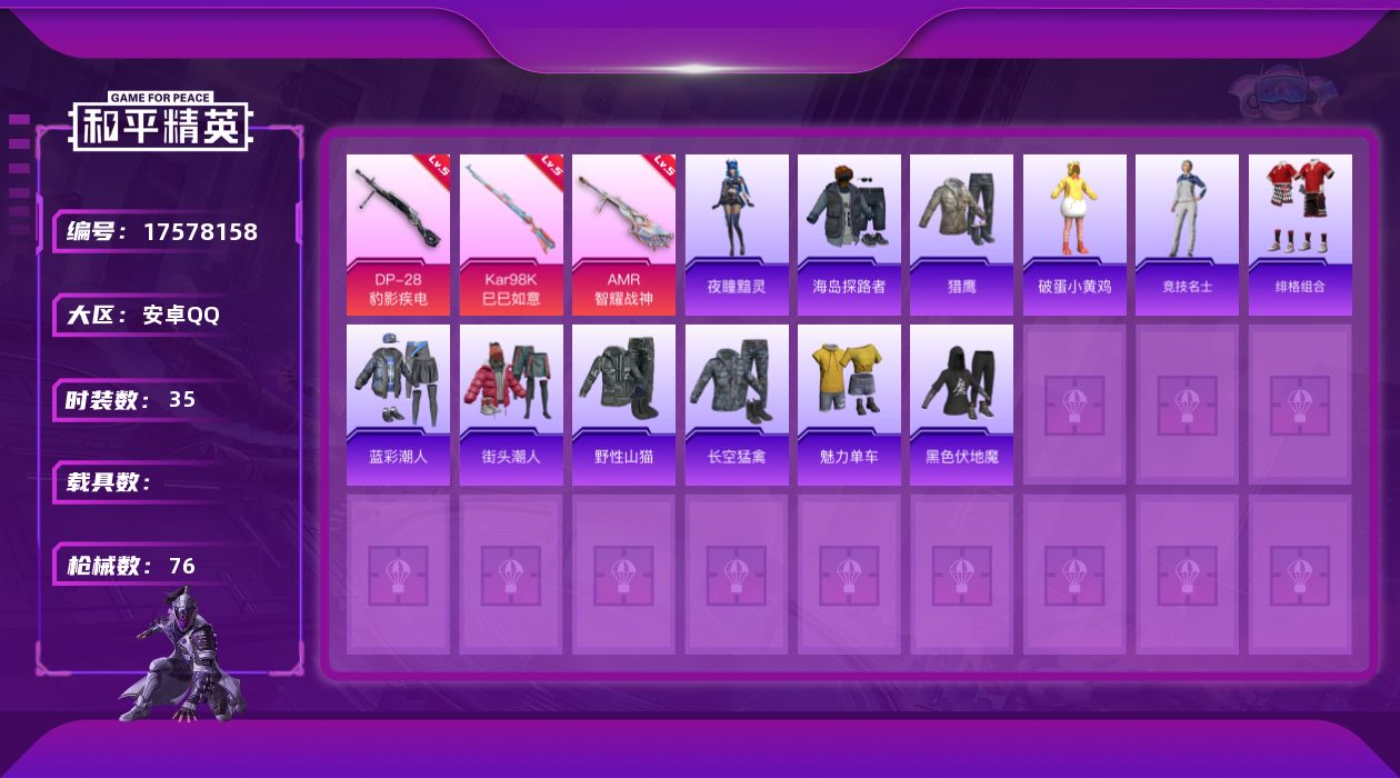 [17578158]安卓 手Q-1粉装-4特效枪-0载具-0粉色飞行器-16175热力值-3王牌印记-35套装-76枪皮