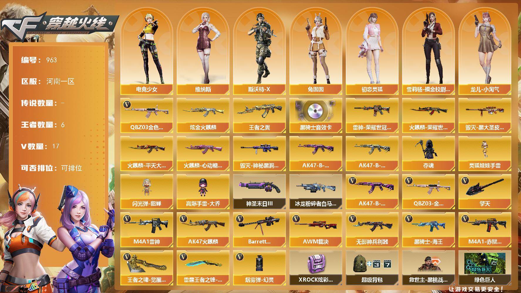 [17571656]河南一区-17V-6王者-1炫金 【热门武器】:QBZ03-金色蔷薇 【王者炫金武器】:王者之翼,炫金火麒麟 【音效卡】:M4A1-黑骑士音效卡 【皮肤】:雷神-荣耀世冠AG,火麒麟-平天大圣,火麒麟-荣耀世冠AG,火麒麟-心动糖果,毁灭-黑大圣皮肤,毁灭-神秘黑洞皮肤,AK47-B-常胜将军-曹操*2,AK47-B-常胜将军-刘备*2 【角色】:王者玲珑-小乔,暗夜-X,北极狐-X,初恋灵狐,电竞少女,风暴女,娟娟,灵狐者-X,流浪蔷薇,龙儿-小淘气,麻雀,潘多拉-X,邱刚敖,青霞仙子,斯沃特-X,蜀雪,兔囡囡,维纳斯,雪莉杨-摸金校尉,影武者-X 【人偶武器】:夺魂,闪光弹-貂蝉,高爆手雷-大乔,灵狐娃娃手雷 【挑战大师】:冰龙粉碎者-白马银枪,神圣爆裂者-末日III 【英雄级武器】:AK47-火麒麟*2,M4A1-雷神,无影-神兵利器,QBZ03-金色蔷薇,黑骑士-海王,AK47-B-常胜将军,Barrett-毁灭,AWM-裁决,擎天,王者之啸-觉醒版,雷霆王者之锋-觉醒版,烟雾弹-幻灵,M4A1-赤狱骑士 【道具】:XROCK炫彩背包,超级背包,救世主-黑桃战神,绿色巨人,灵魂忍者*3,妖姬*2,迷雾幽灵,生化弹匣,夺命之镰,防化服*2,金色流光-枪王排位,枪王排位29赛季金色流光,EP战队名片,防弹头盔*8,防弹衣*10,C4工具钳*6,手雷包*6 【特殊枪械】: